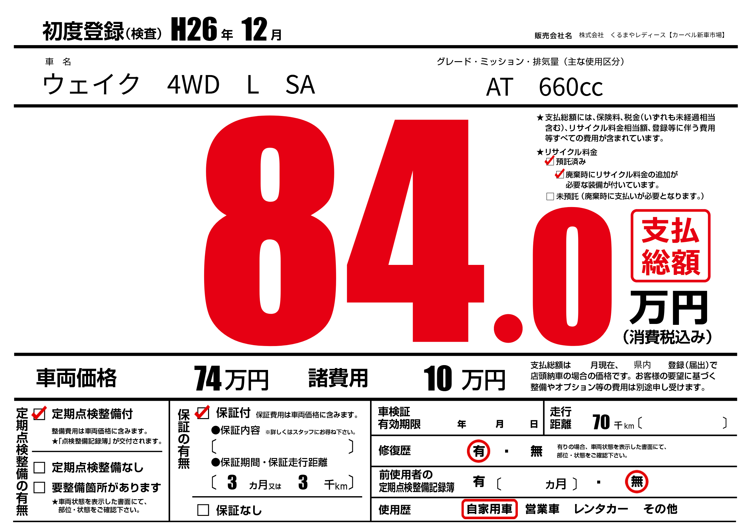 | 走行キロ | 7万km | 初年度登録 | H26年12月 |