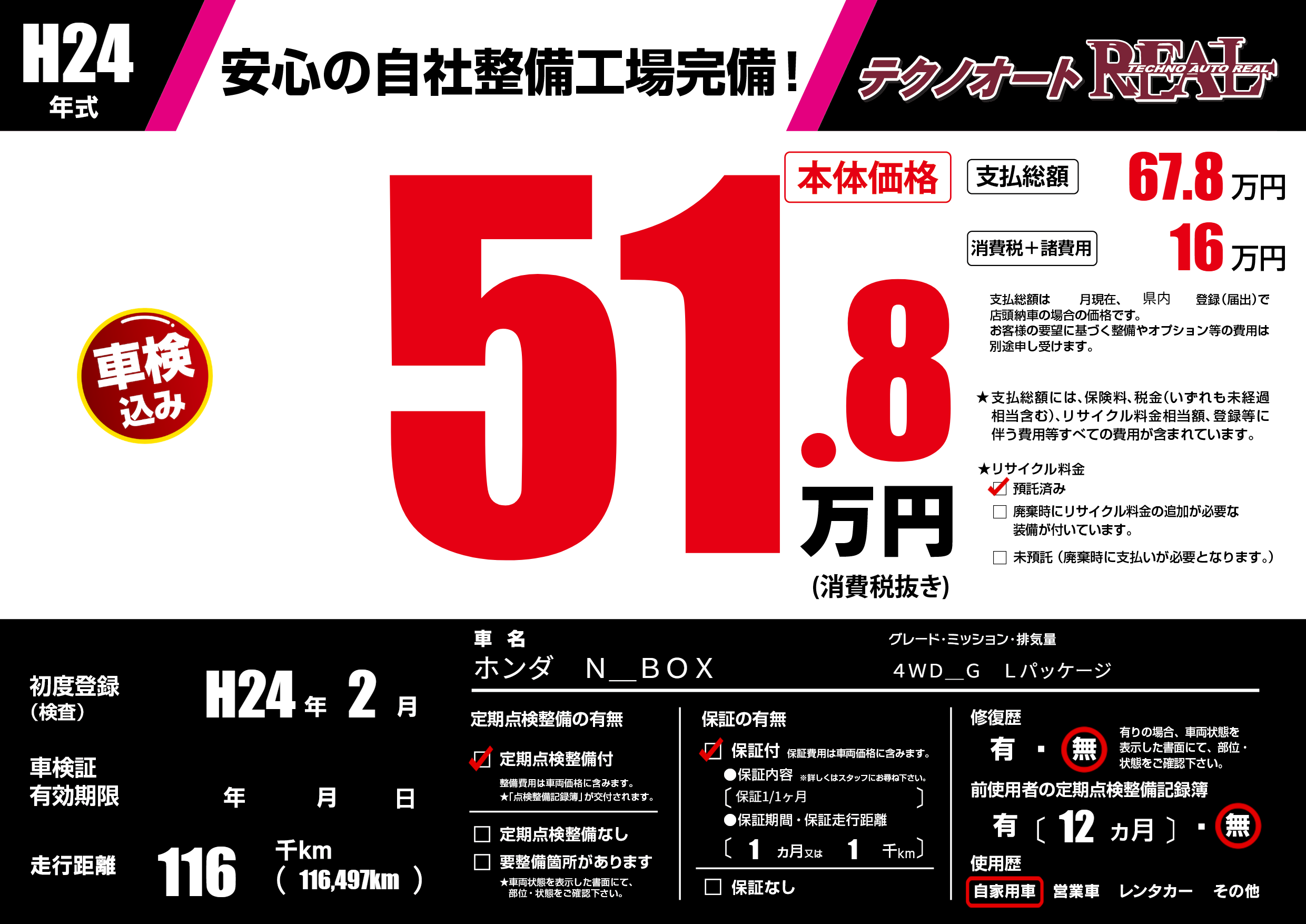 | 車名 | ホンダ N_BOX | グレード ミッション 排気量 |