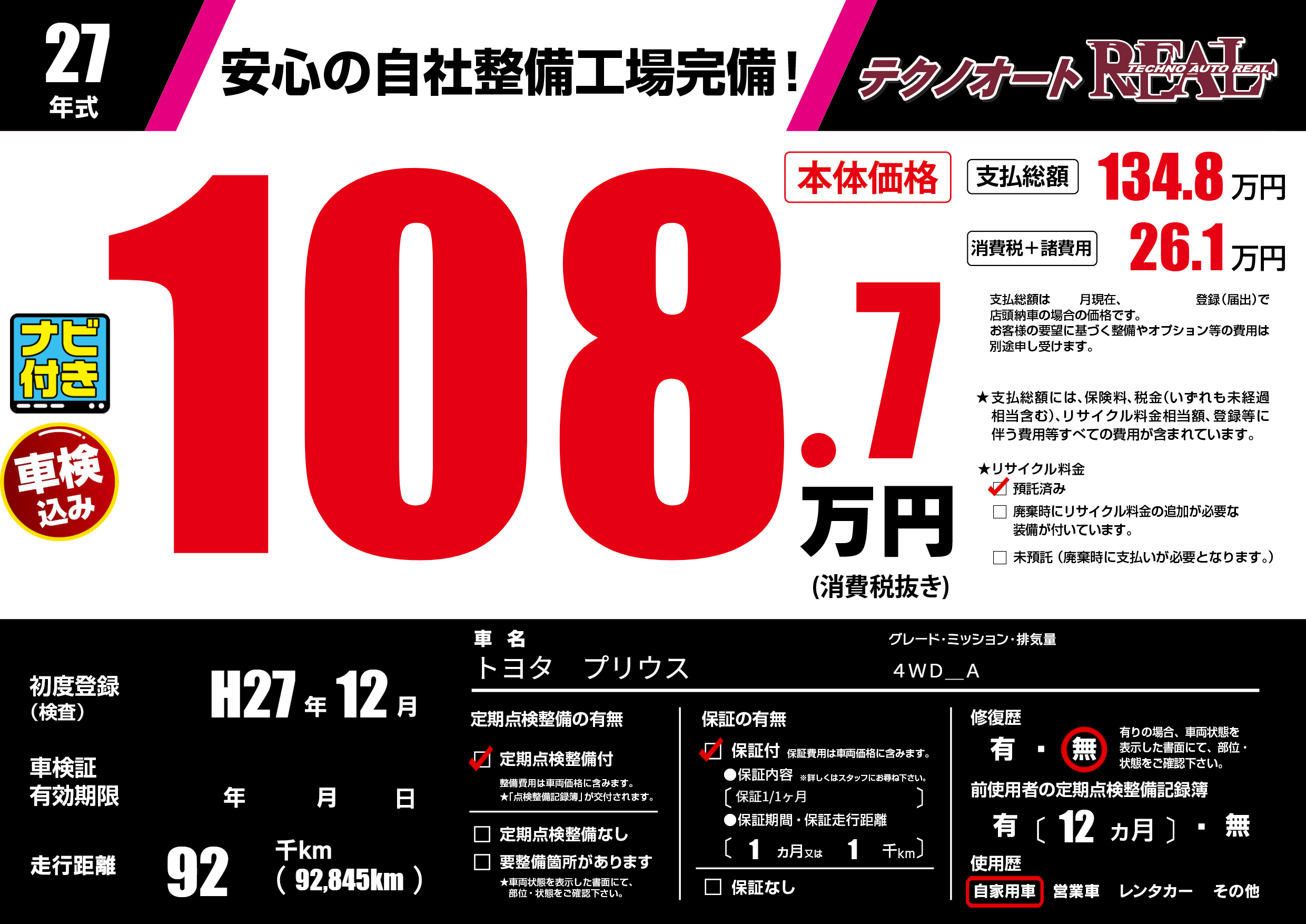 | 走行キロ | 9.2万km | 初年度登録 | H27年12月 |