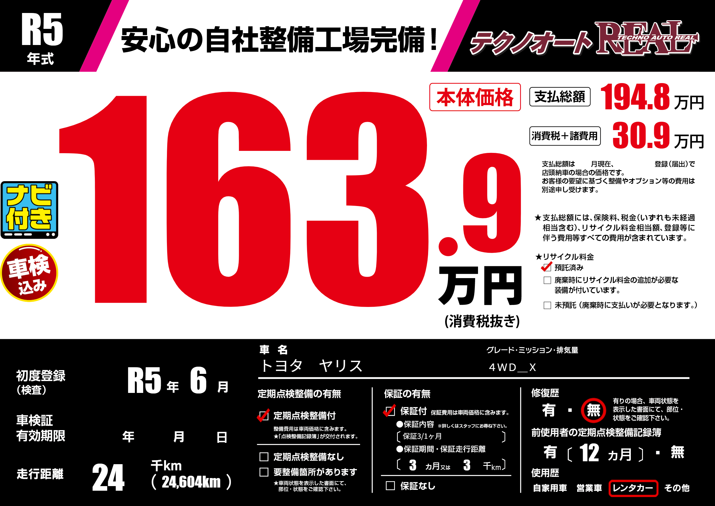 | 車名 | トヨタ ヤリス | グレード ミッション 排気量 |