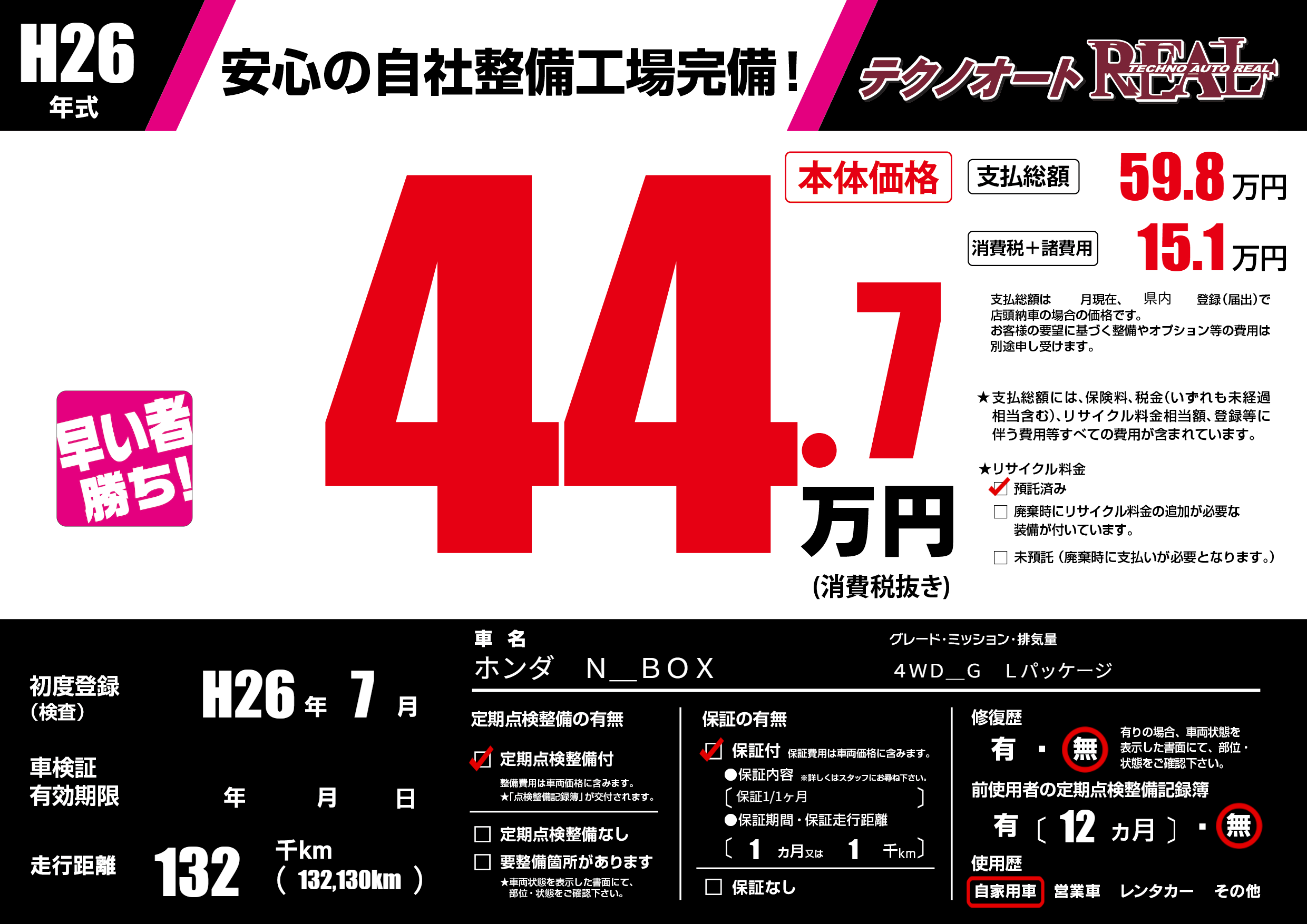 | 車名 | ホンダ N_BOX | グレード ミッション 排気量 |