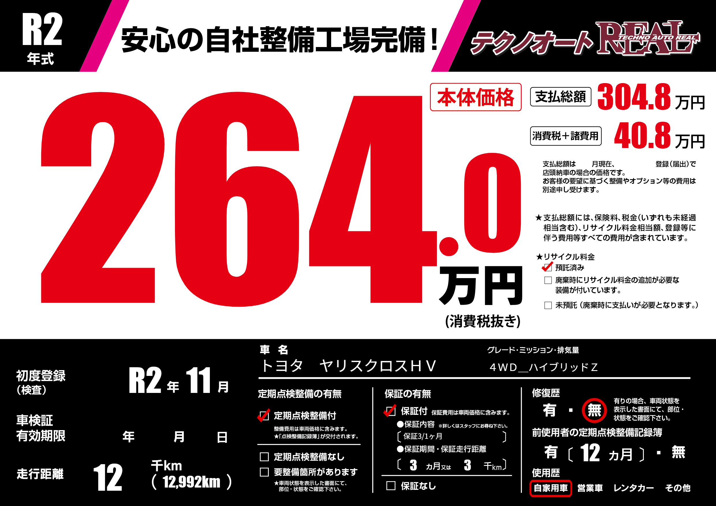 | 車名 | トヨタ ヤリスクロスHV | グレード ミッション 排気量 |