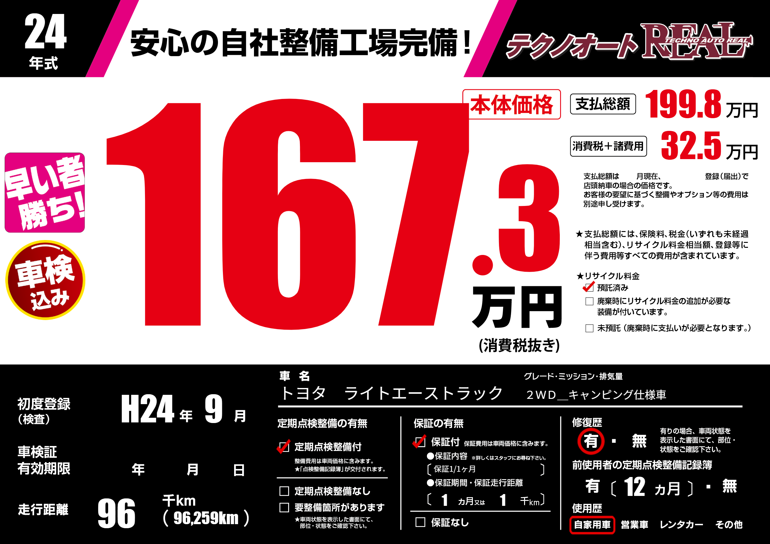 | 走行キロ | 9.6万km | 初年度登録 | H24年9月 |