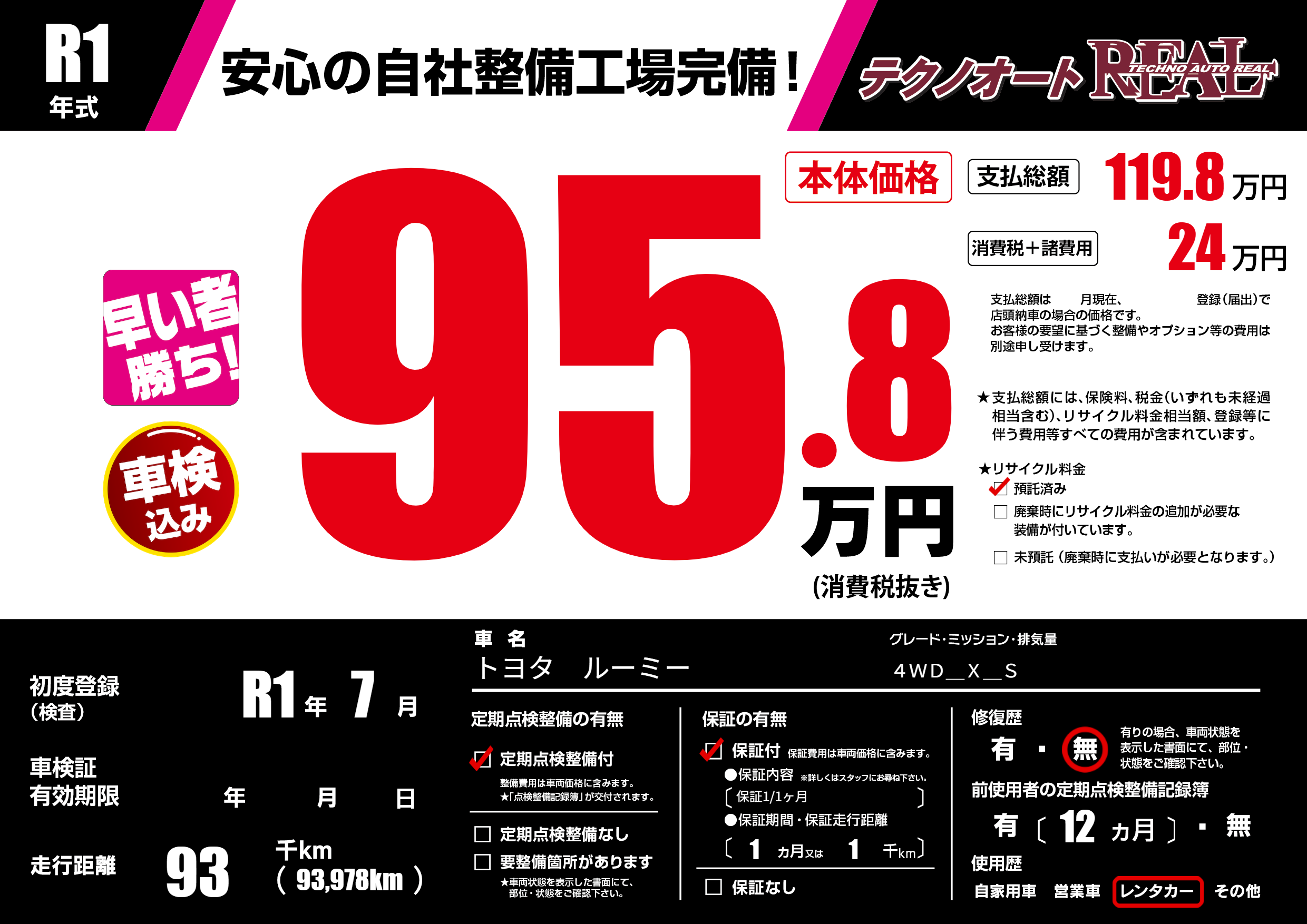 | 車名 | トヨタ ルーミー | グレード ミッション 排気量 |