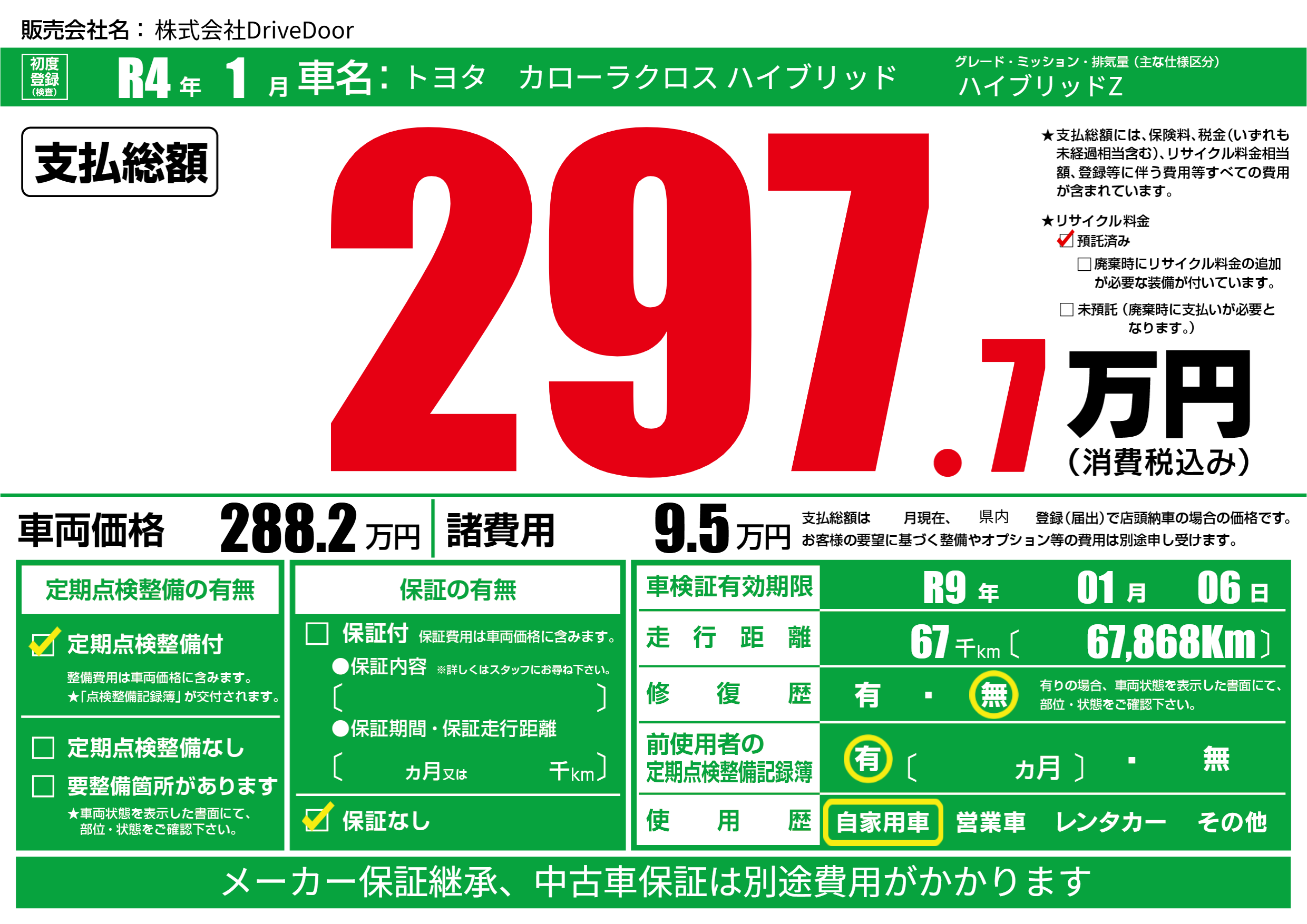 | 車名 | トヨタ カローラクロス ハイブリッド | グレード ミッション 排気量 |