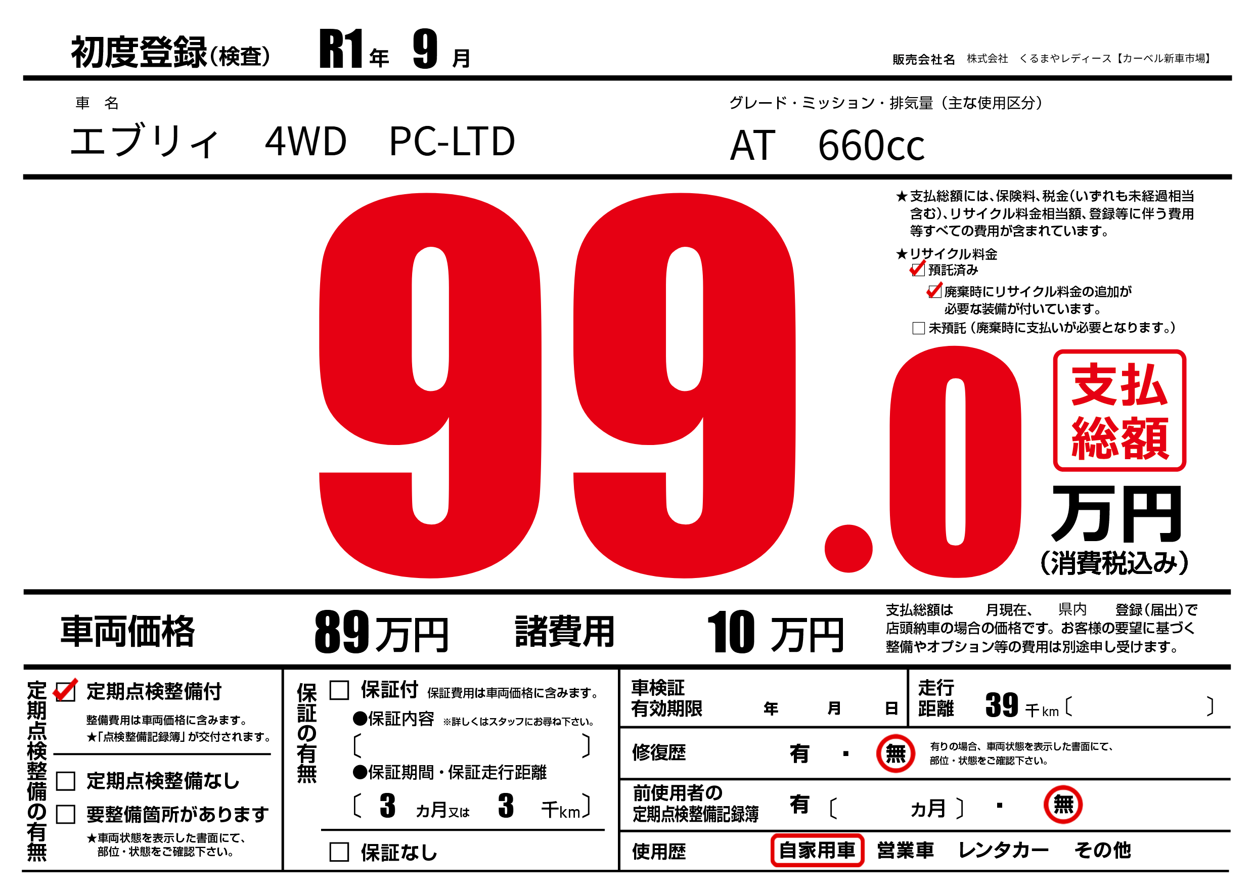 | 車名 | エブリィ 4WD PC-LTD | グレード ミッション 排気量 |