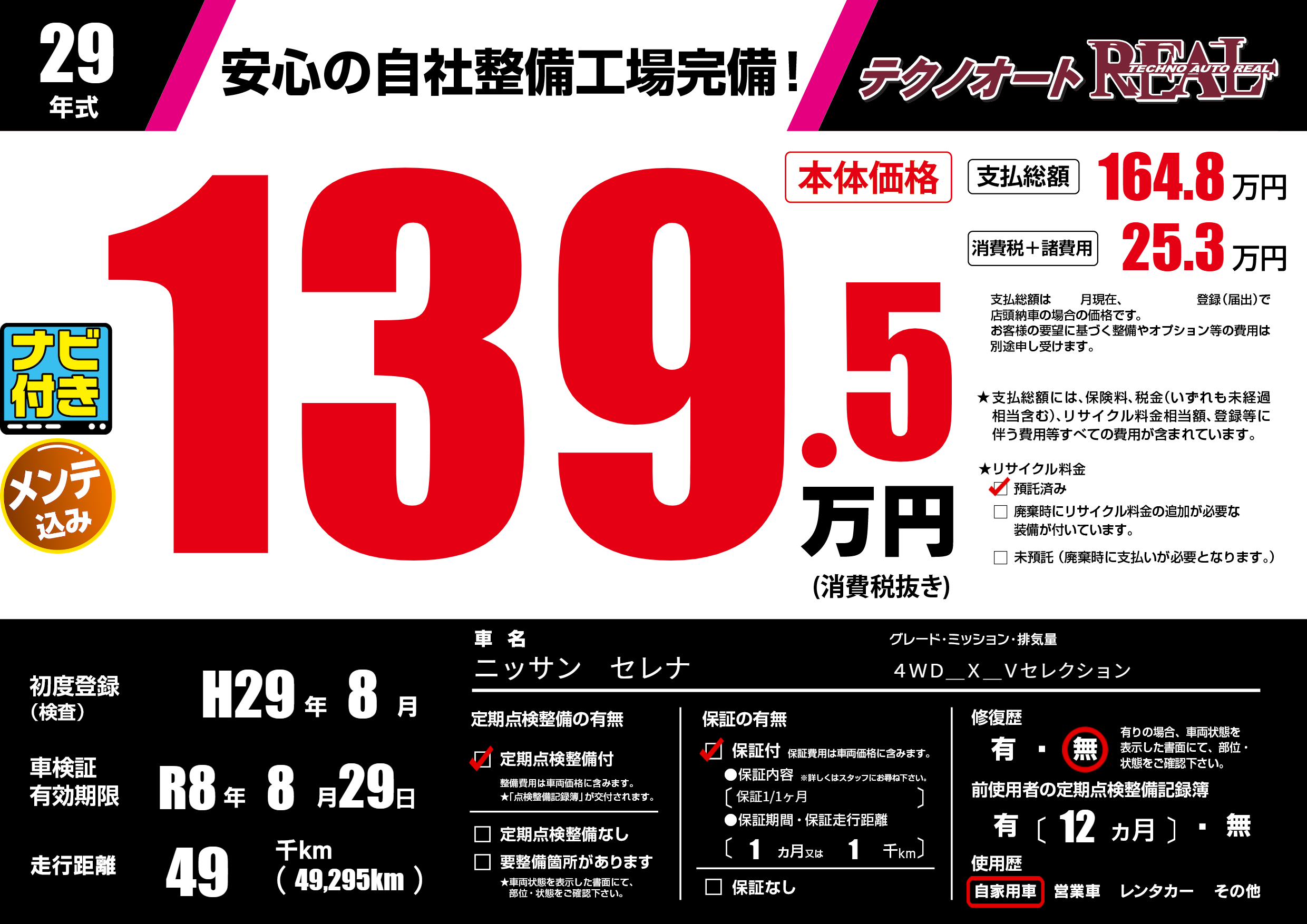 | 走行キロ | 4.9万km | 初年度登録 | H29年8月 |