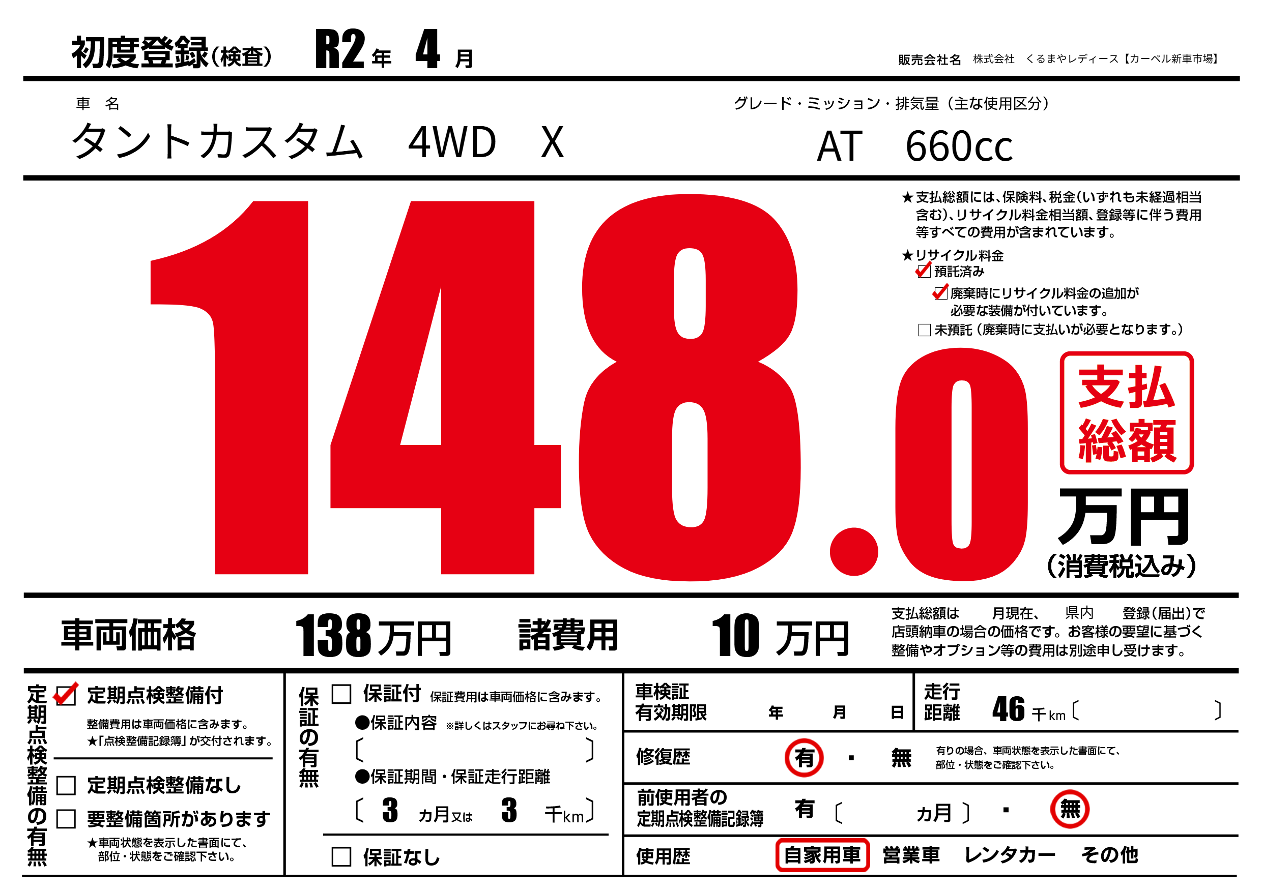 | 車名 | タントカスタム 4WD X | グレード ミッション 排気量 |