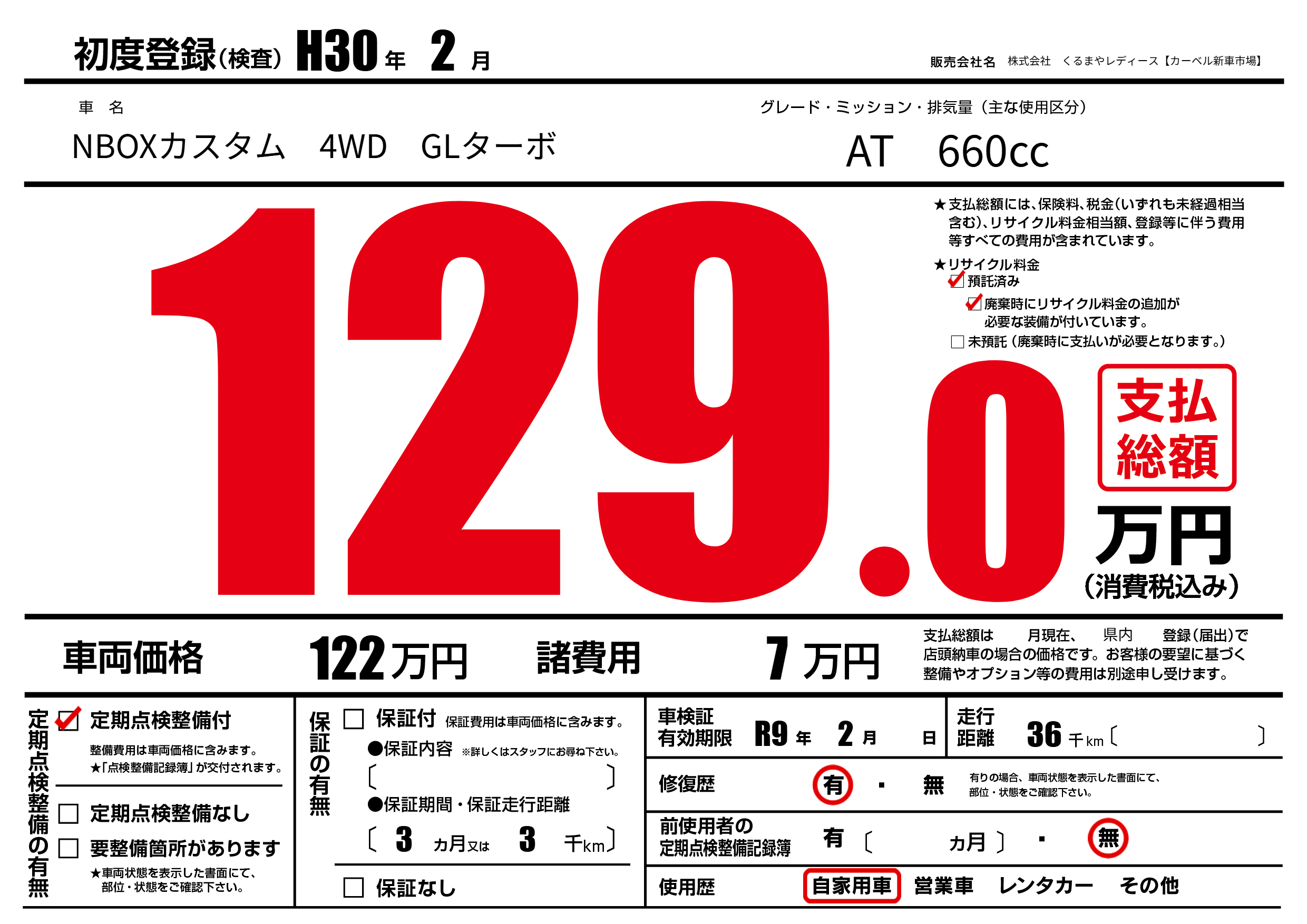| 車名 | NBOXカスタム 4WD GLターボ | グレード ミッション 排気量 |