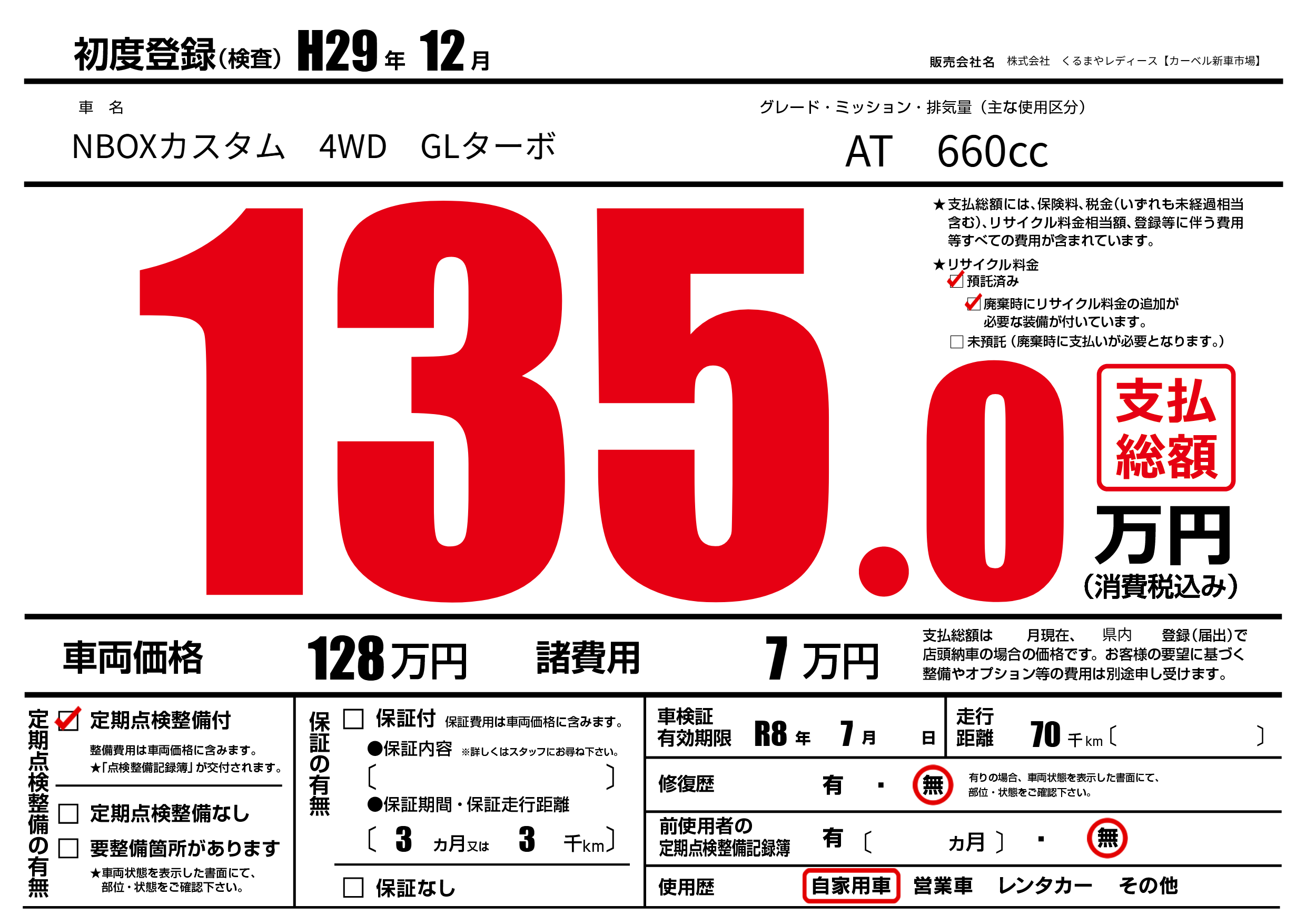 | 走行キロ | 7万km | 初年度登録 | H29年12月 |