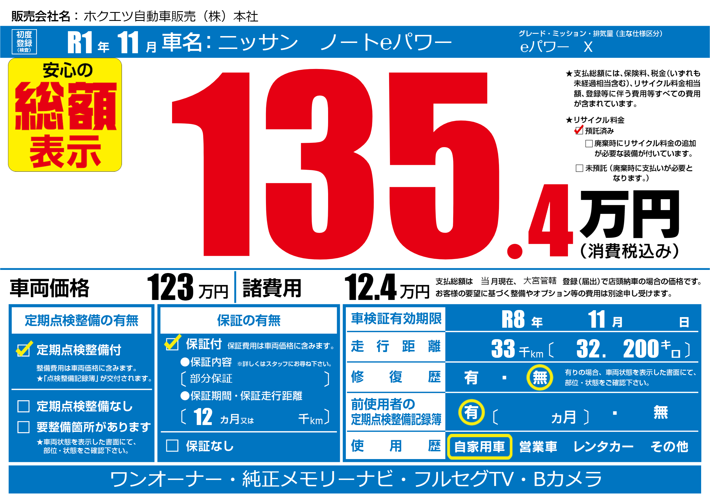 | 車名 | ニッサン ノート℮パワー | グレード ミッション 排気量 |