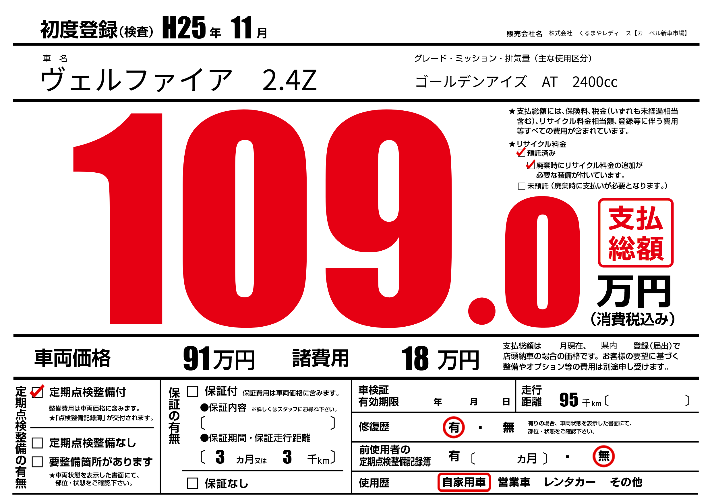 | 車名 | ヴェルファイア 2.4Z | グレード ミッション 排気量 |