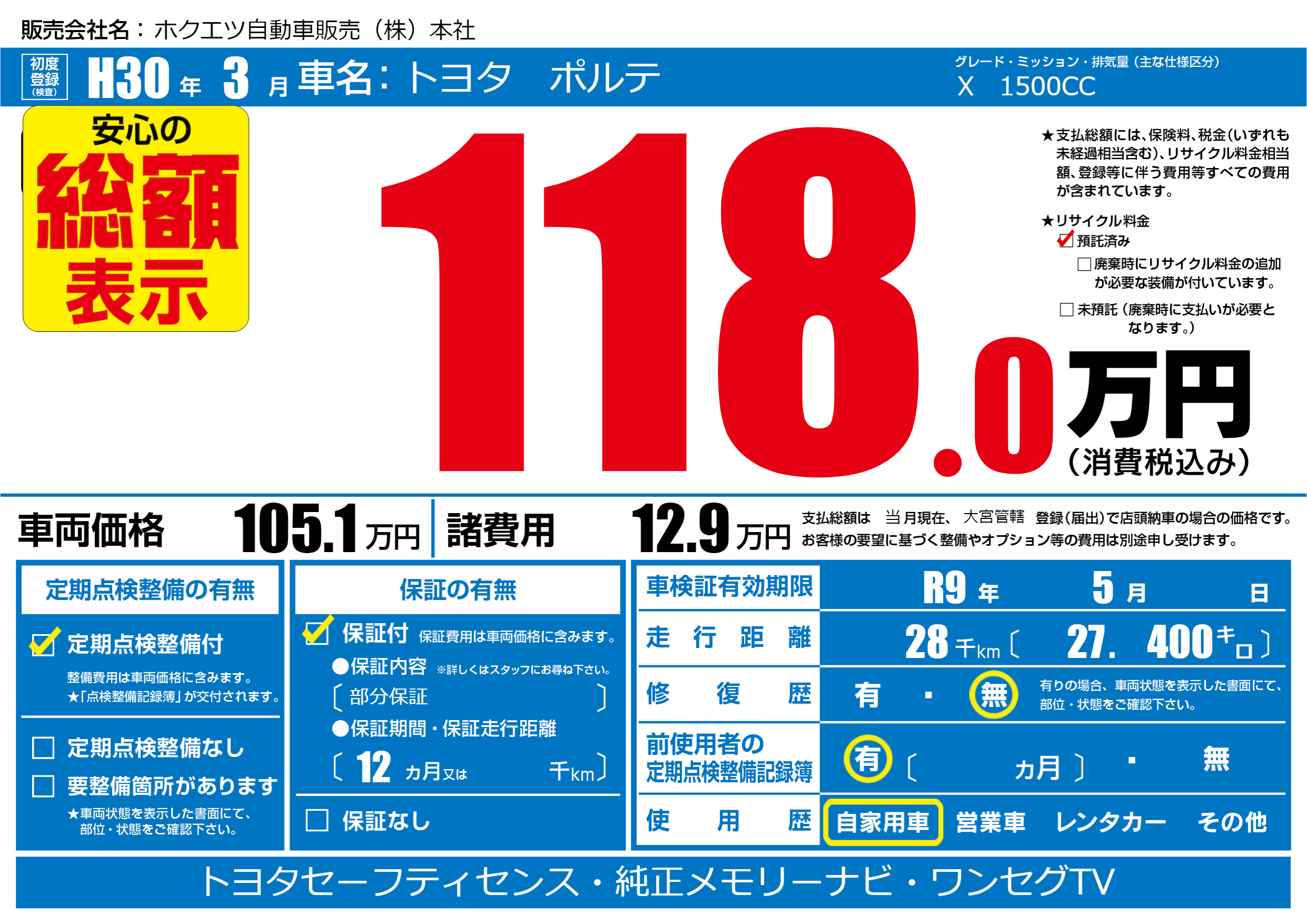 | 車名 | トヨタ ポルテ | グレード ミッション 排気量 |