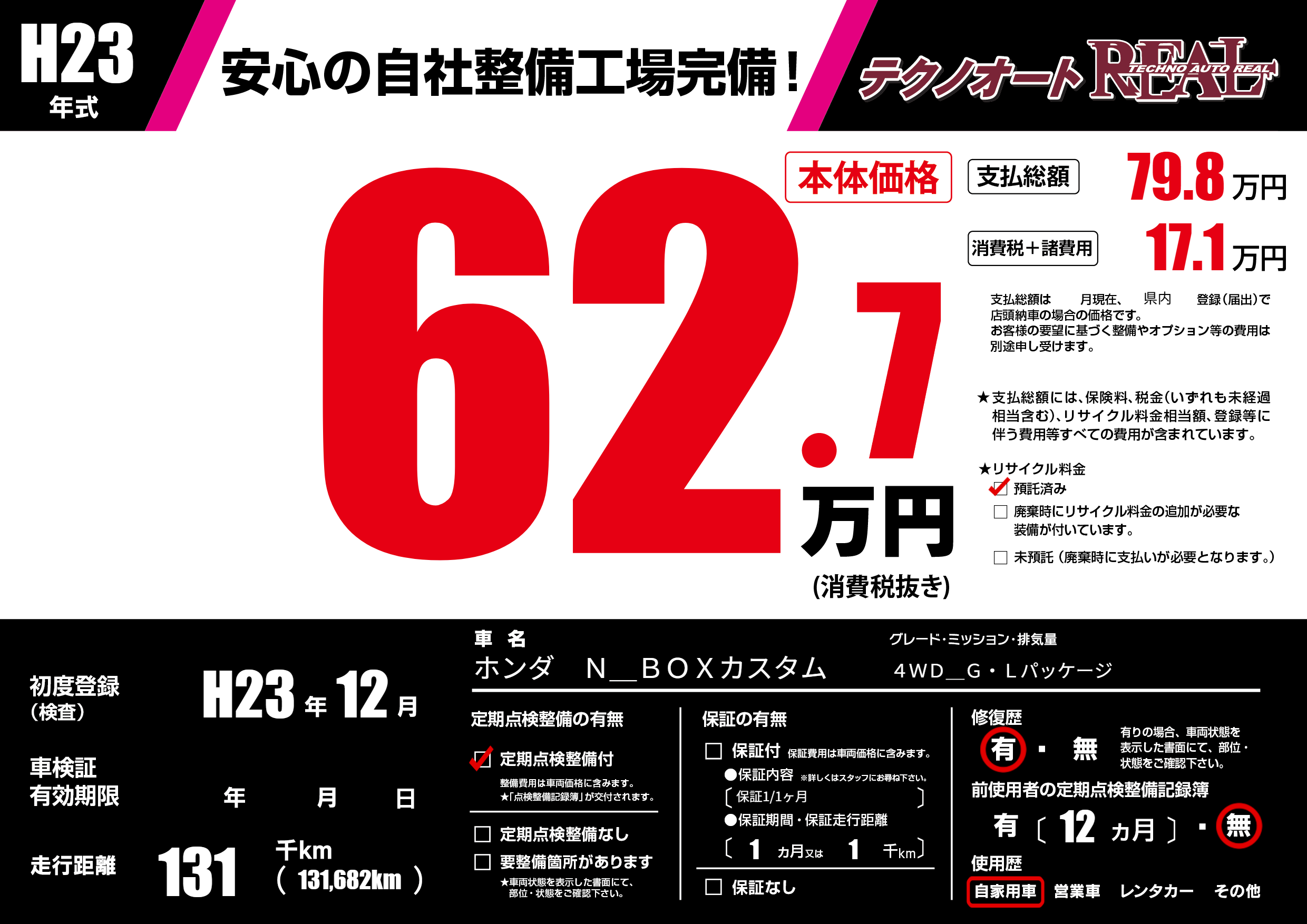 | 走行キロ | 13.1万km | 初年度登録 | H23年12月 |