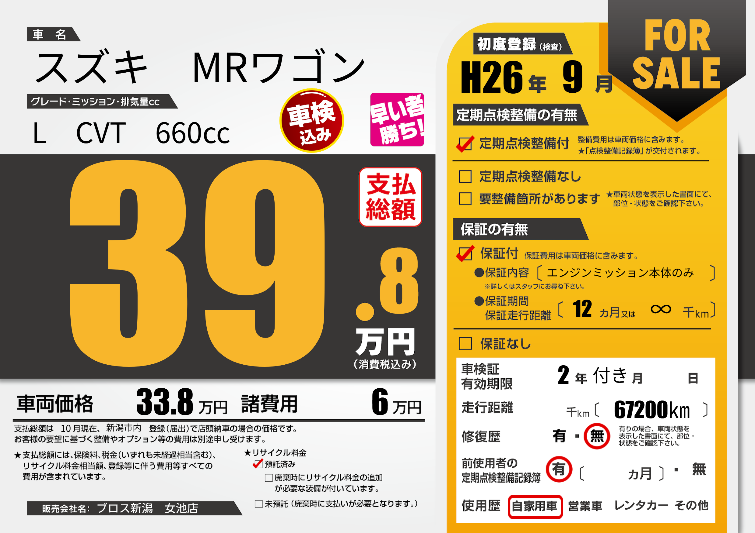 | 走行キロ | - | 初年度登録 | H26年9月 |