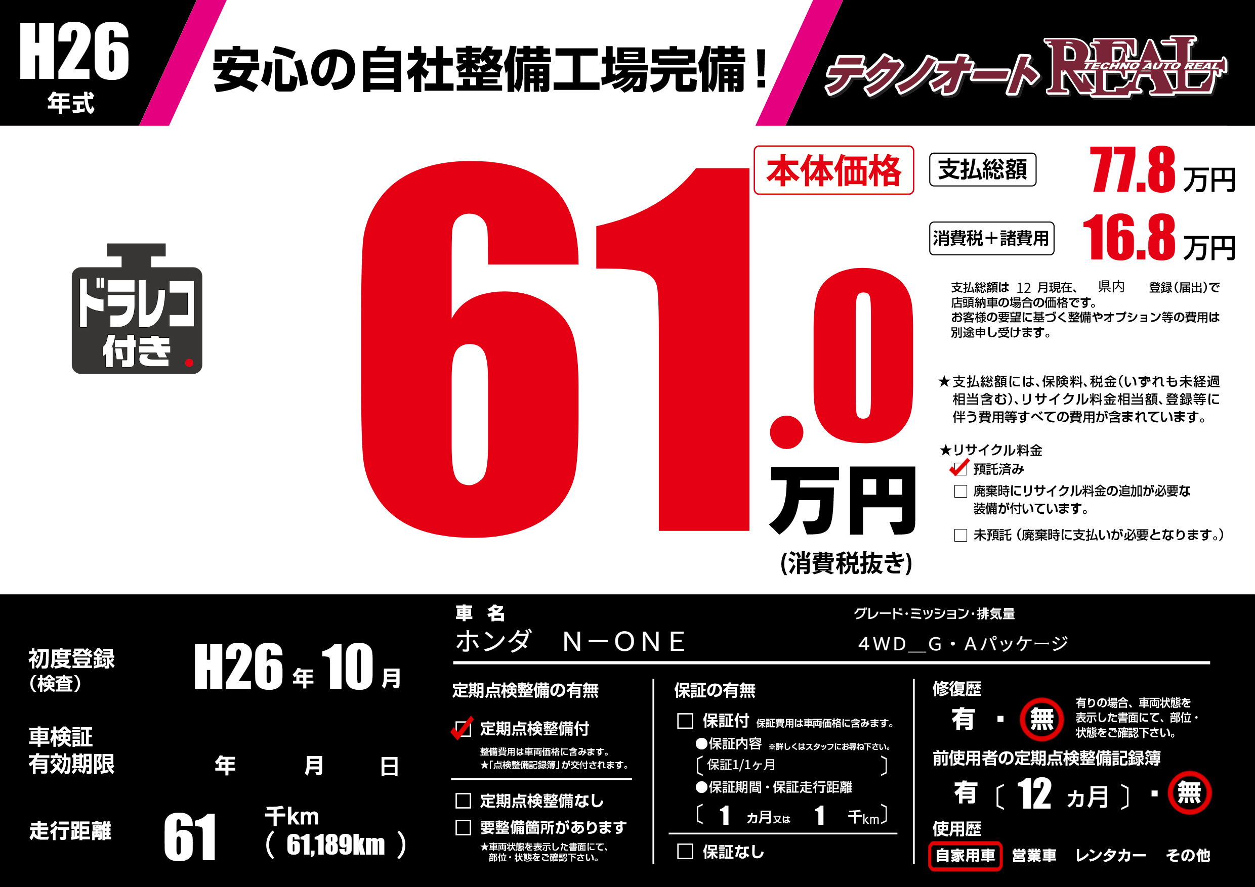 | 走行キロ | 6.1万km | 初年度登録 | H26年10月 |
