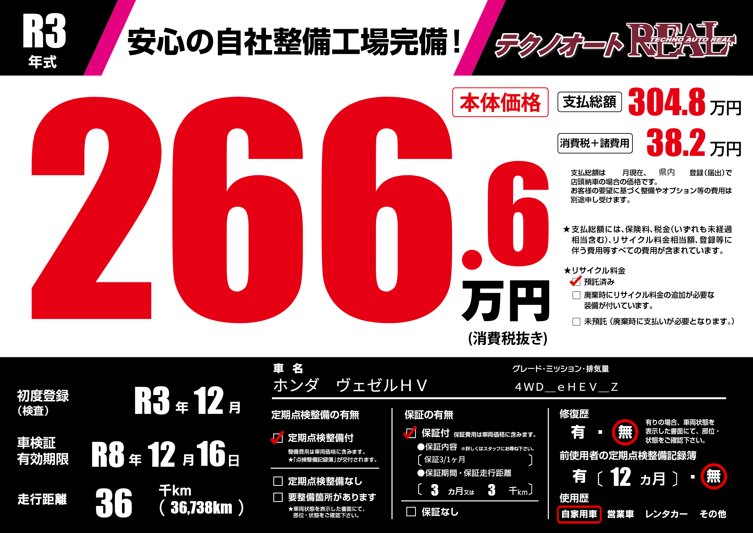 | 車名 | ホンダ ヴェゼルHV | グレード ミッション 排気量 |