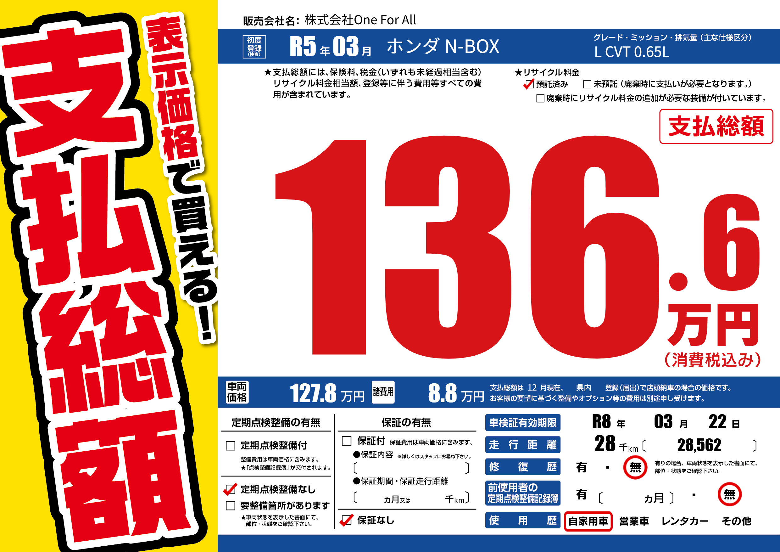 | 走行キロ | 2.8万km | 初年度登録 | R5年03月 |