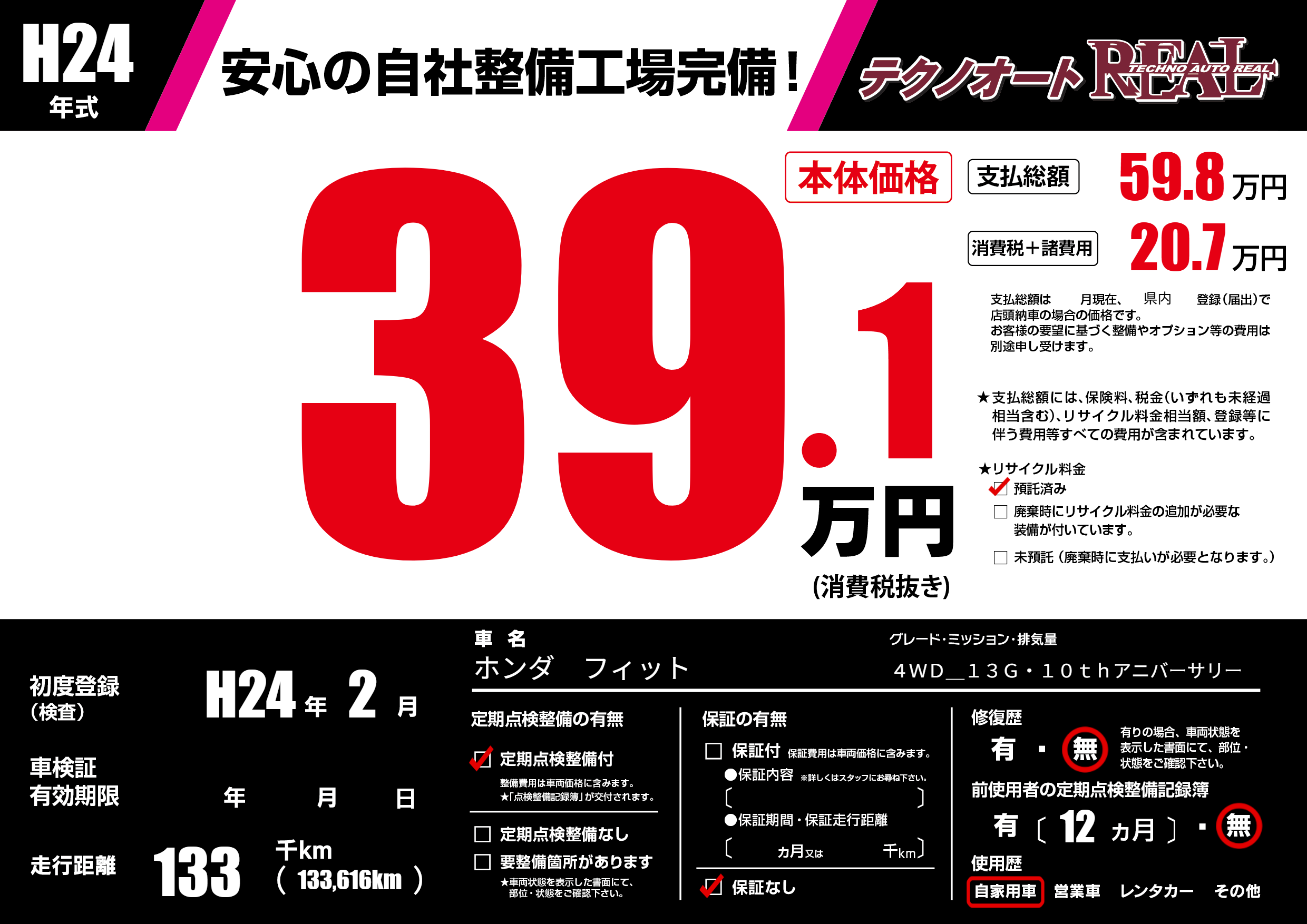 | 走行キロ | 13.3万km | 初年度登録 | H24年2月 |