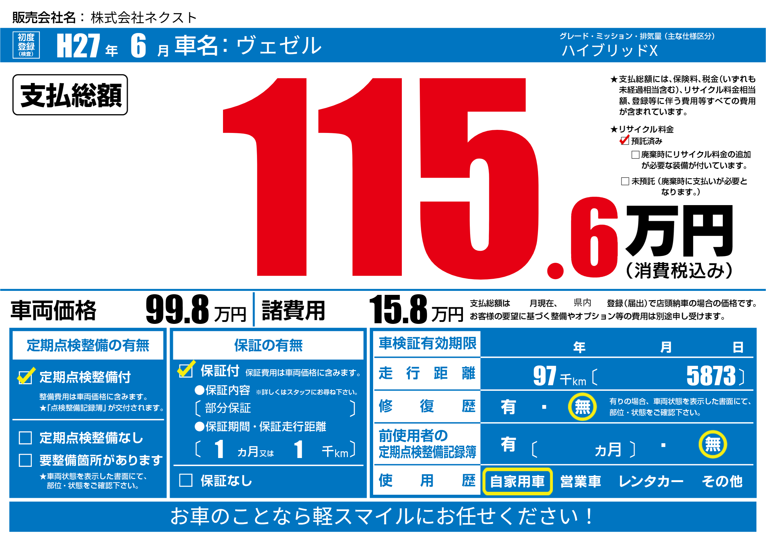 | 車名 | ヴェゼル | グレード ミッション 排気量 |