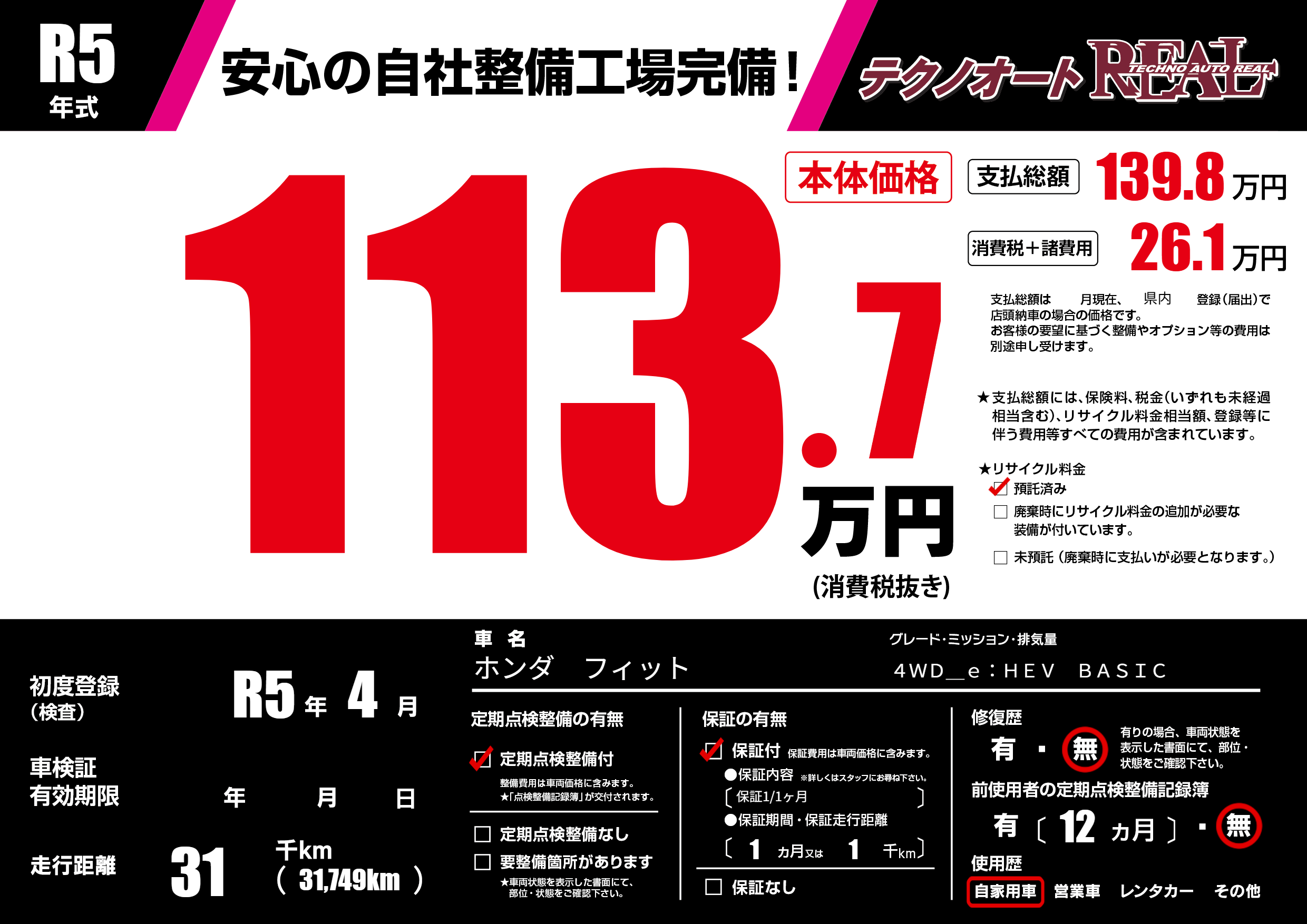 | 走行キロ | 3.1万km | 初年度登録 | R5年4月 |