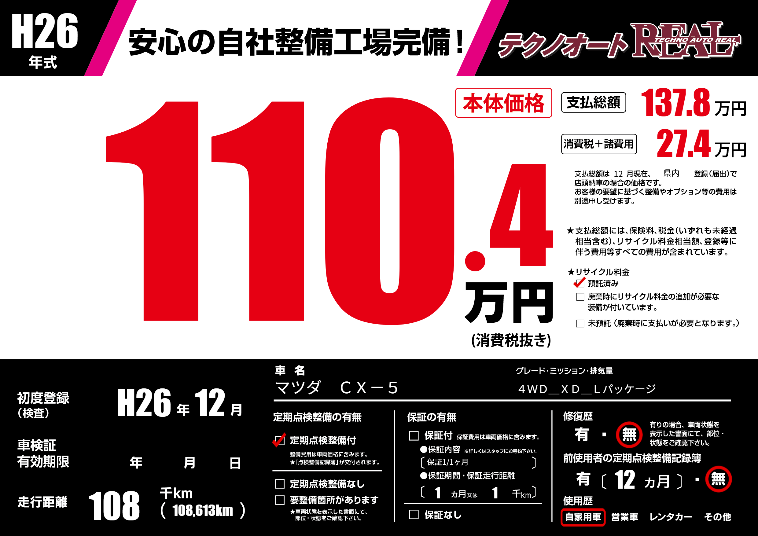 | 走行キロ | 10.8万km | 初年度登録 | H26年12月 |