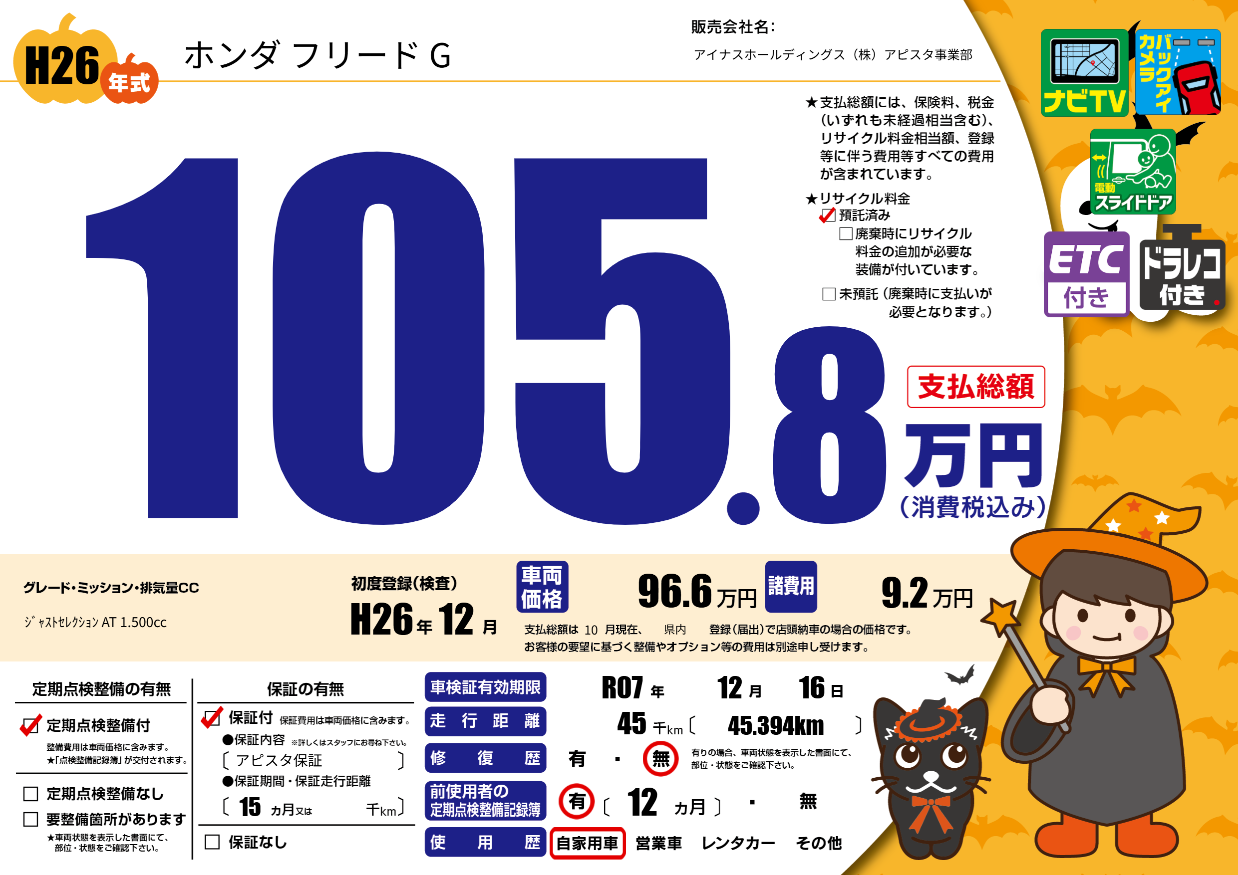 | 走行キロ | 4.5万km | 初年度登録 | H26年12月 |