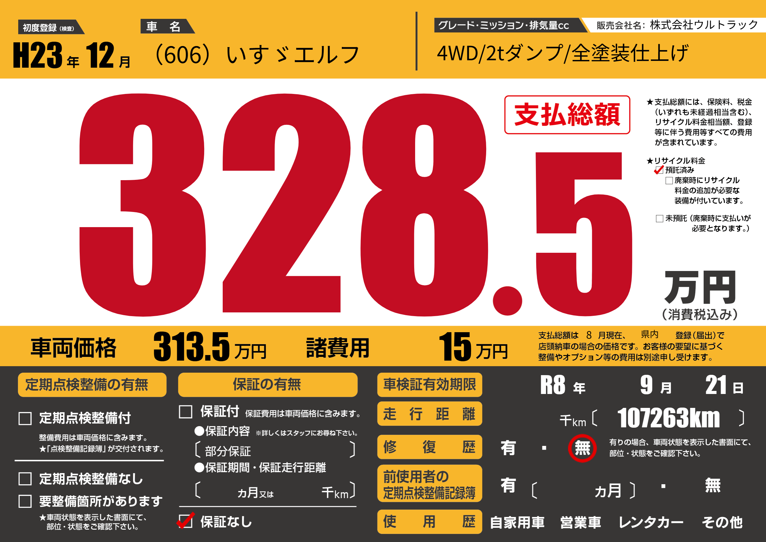| 車名 | (606)いすゞエルフ | グレード ミッション 排気量 |