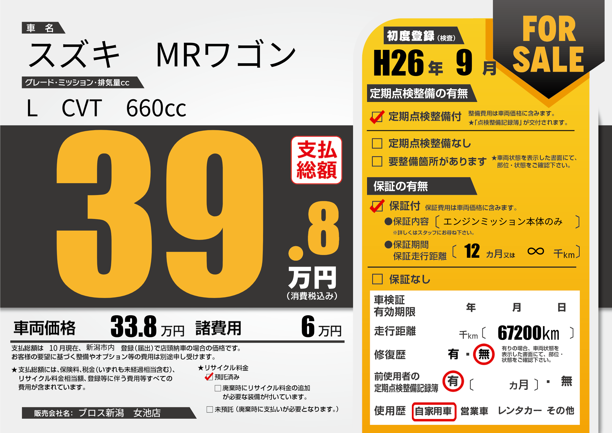 | 走行キロ | - | 初年度登録 | H26年9月 |