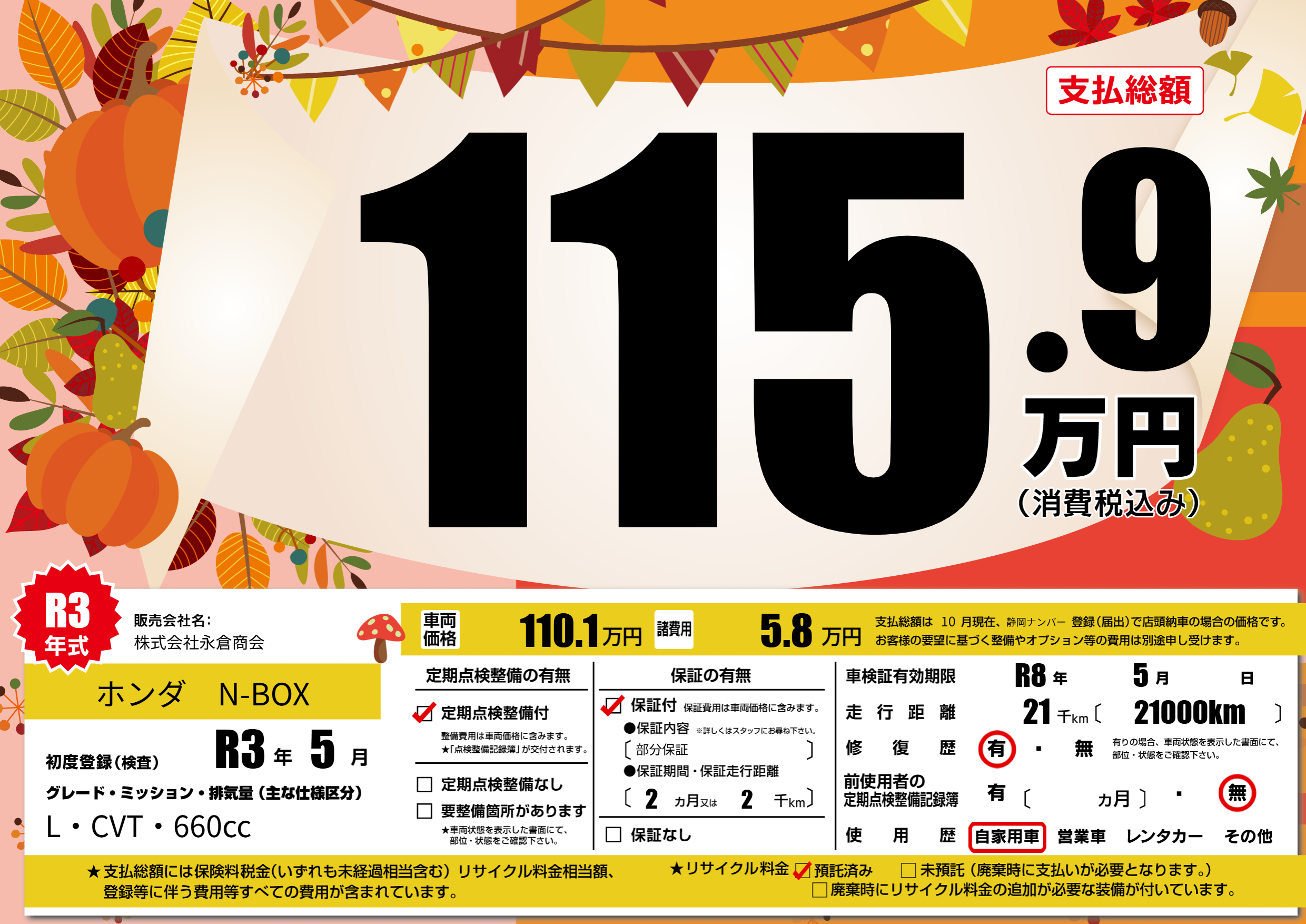 | 走行キロ | 2.1万km | 初年度登録 | R3年5月 |