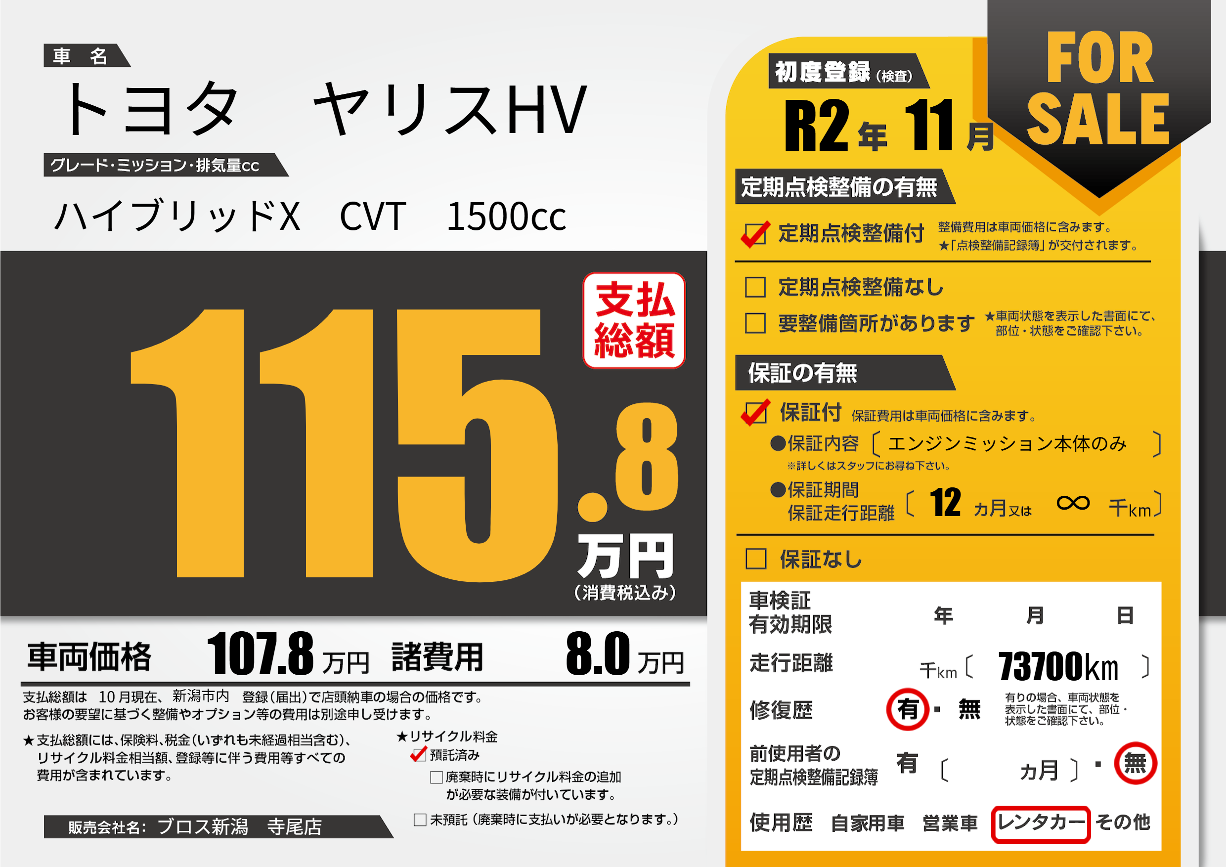 | 車名 | トヨタ ヤリスHV | グレード ミッション 排気量 |