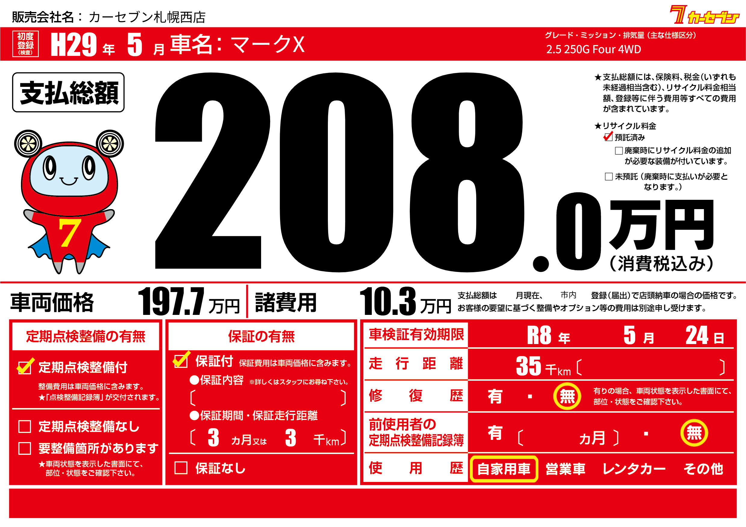 | 走行キロ | 3.5万km | 初年度登録 | H29年5月 |