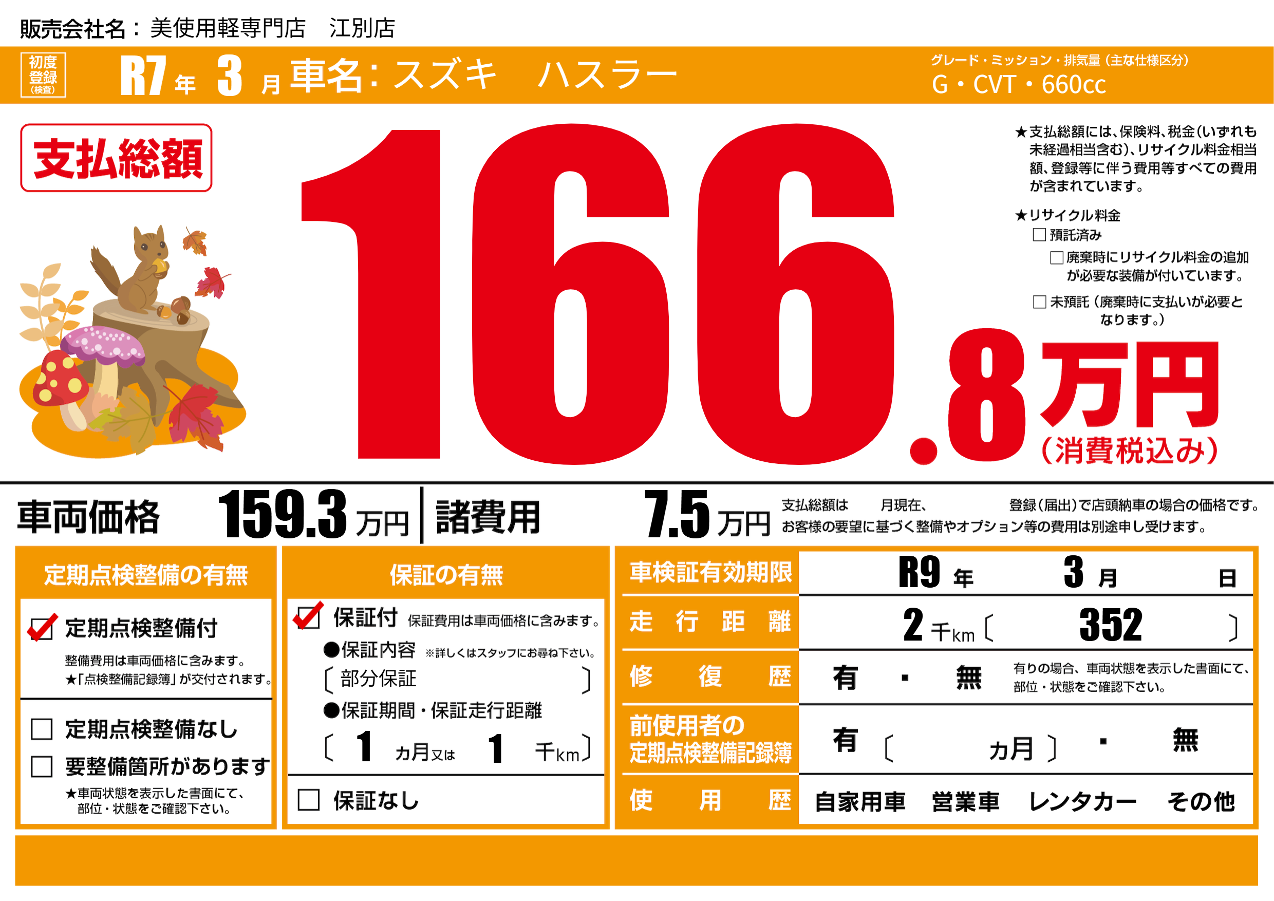 | 車名 | スズキ ハスラー | グレード ミッション 排気量 |