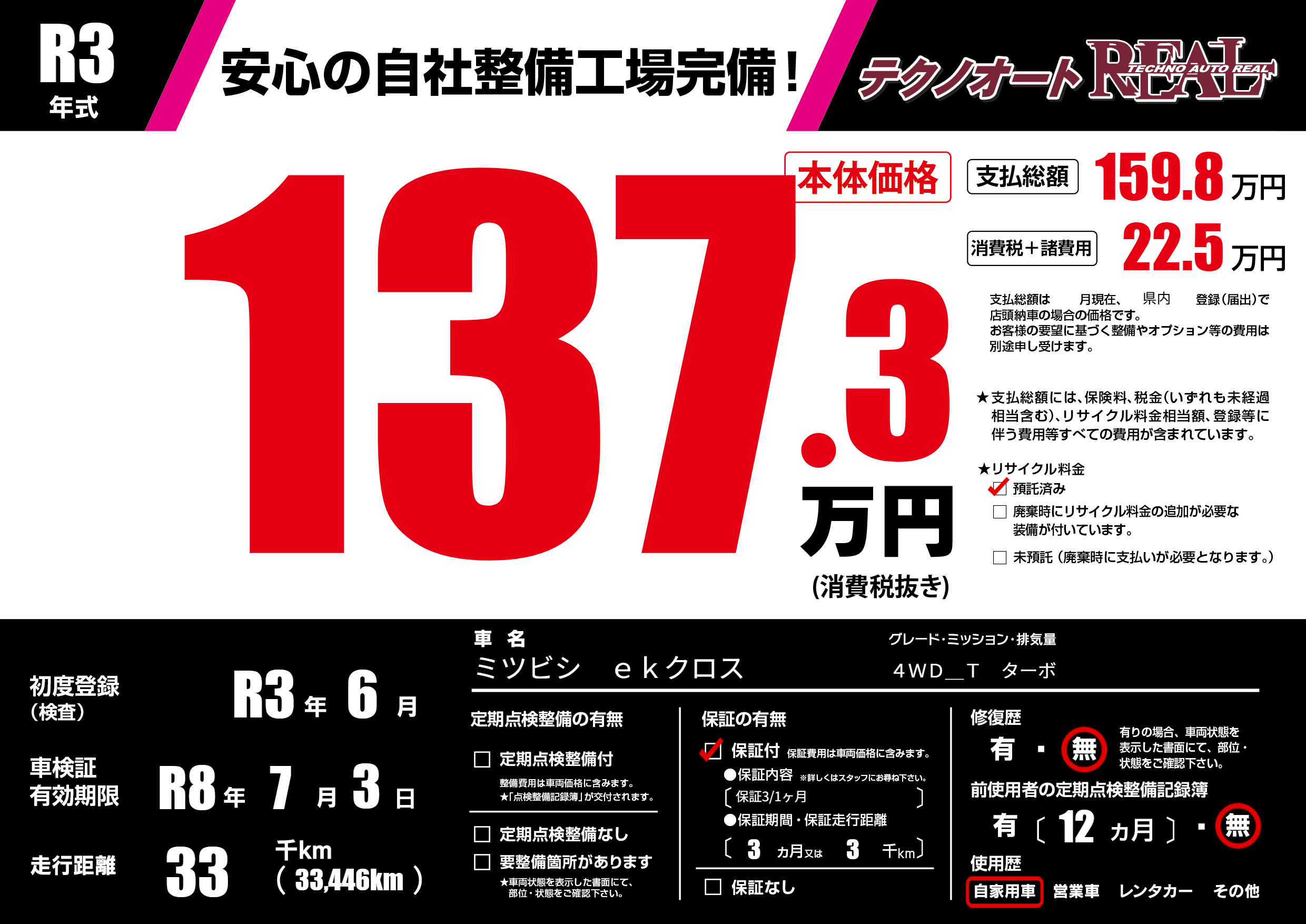 | 走行キロ | 3.3万km | 初年度登録 | R3年6月 |