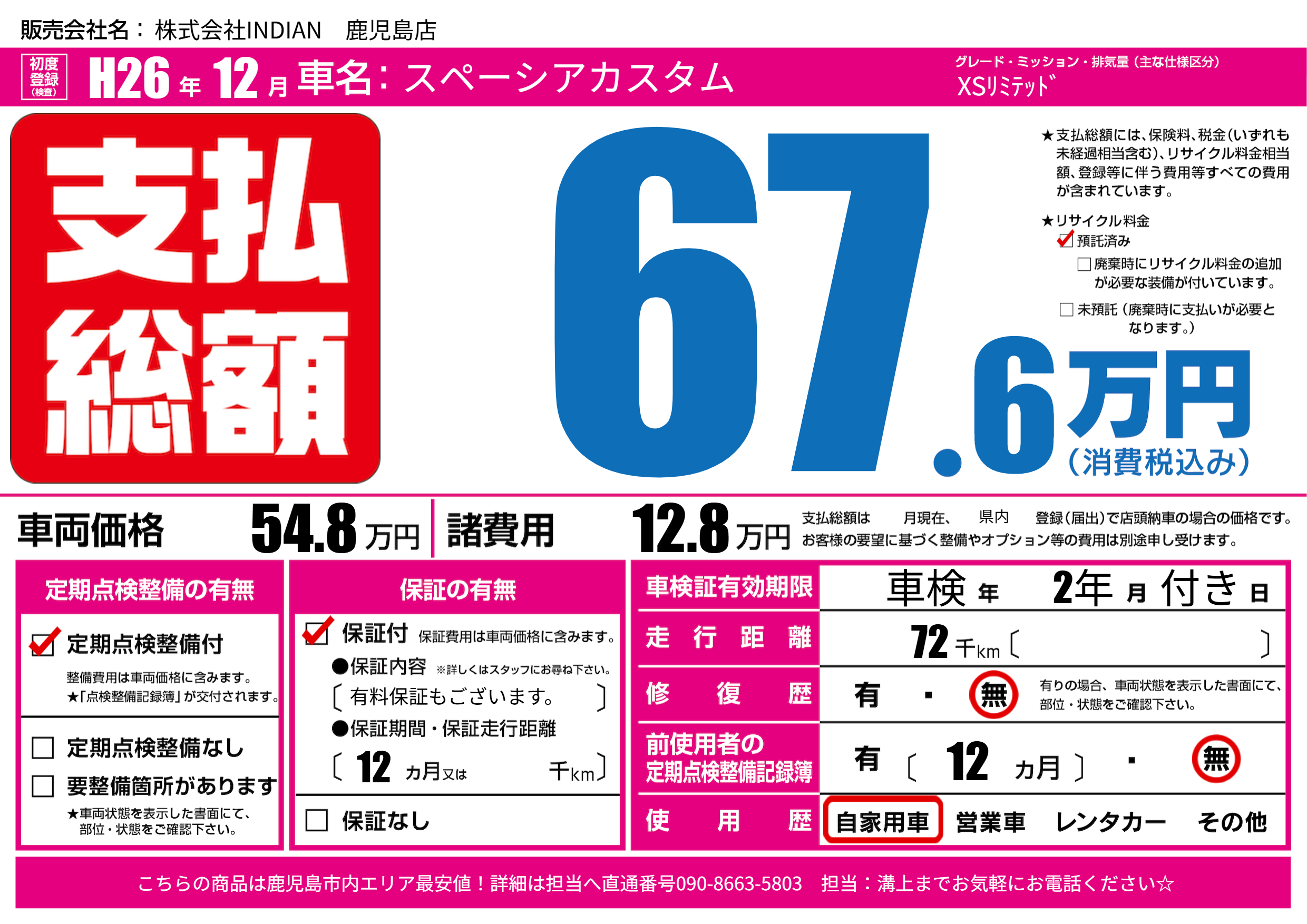 | 走行キロ | 7.2万km | 初年度登録 | H26年12月 |