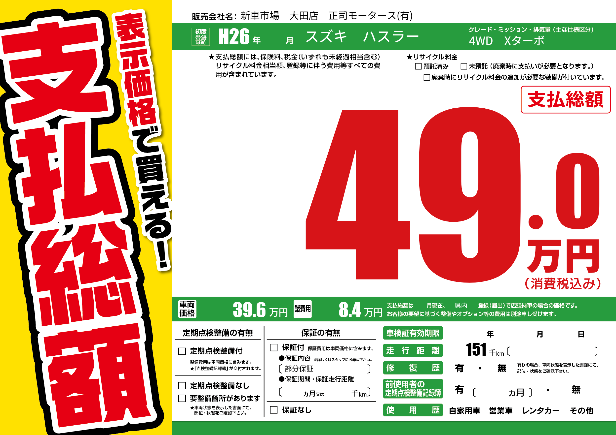 | 車名 | スズキ ハスラー | グレード ミッション 排気量 |