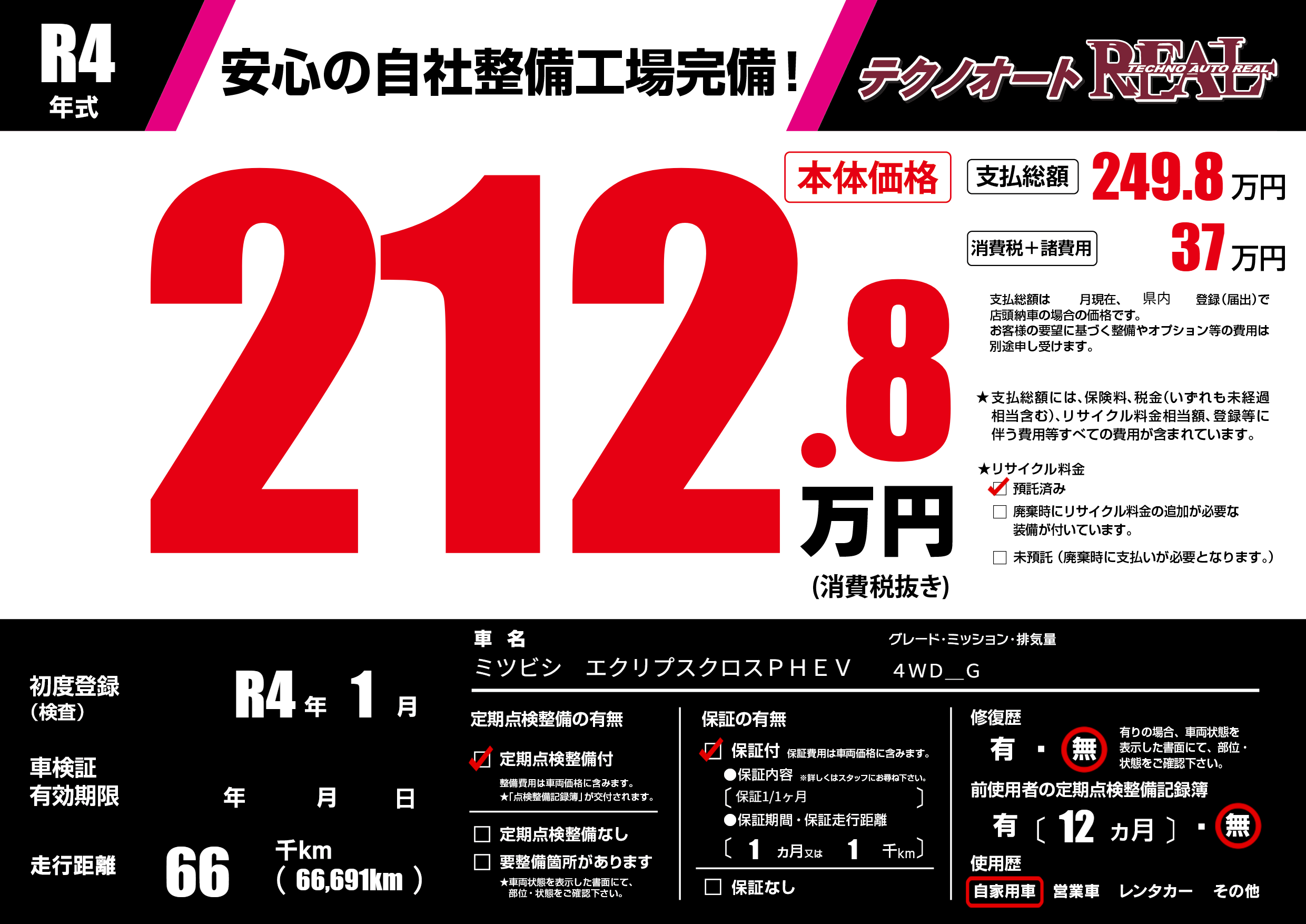 | 車名 | ミツビシ エクリプスクロスPHEV | グレード ミッション 排気量 |