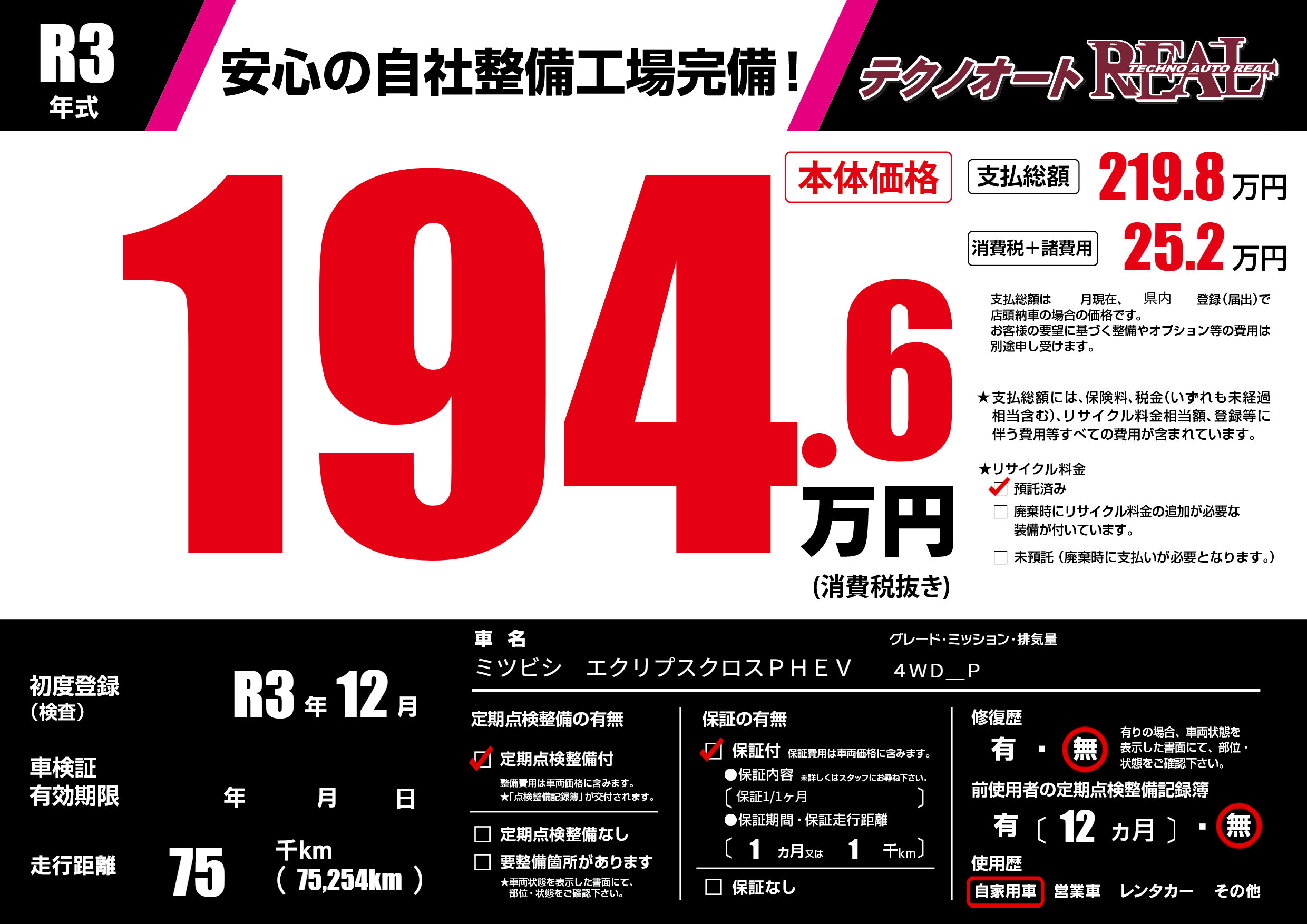 | 車名 | ミツビシ エクリプスクロスPHEV | グレード ミッション 排気量 |