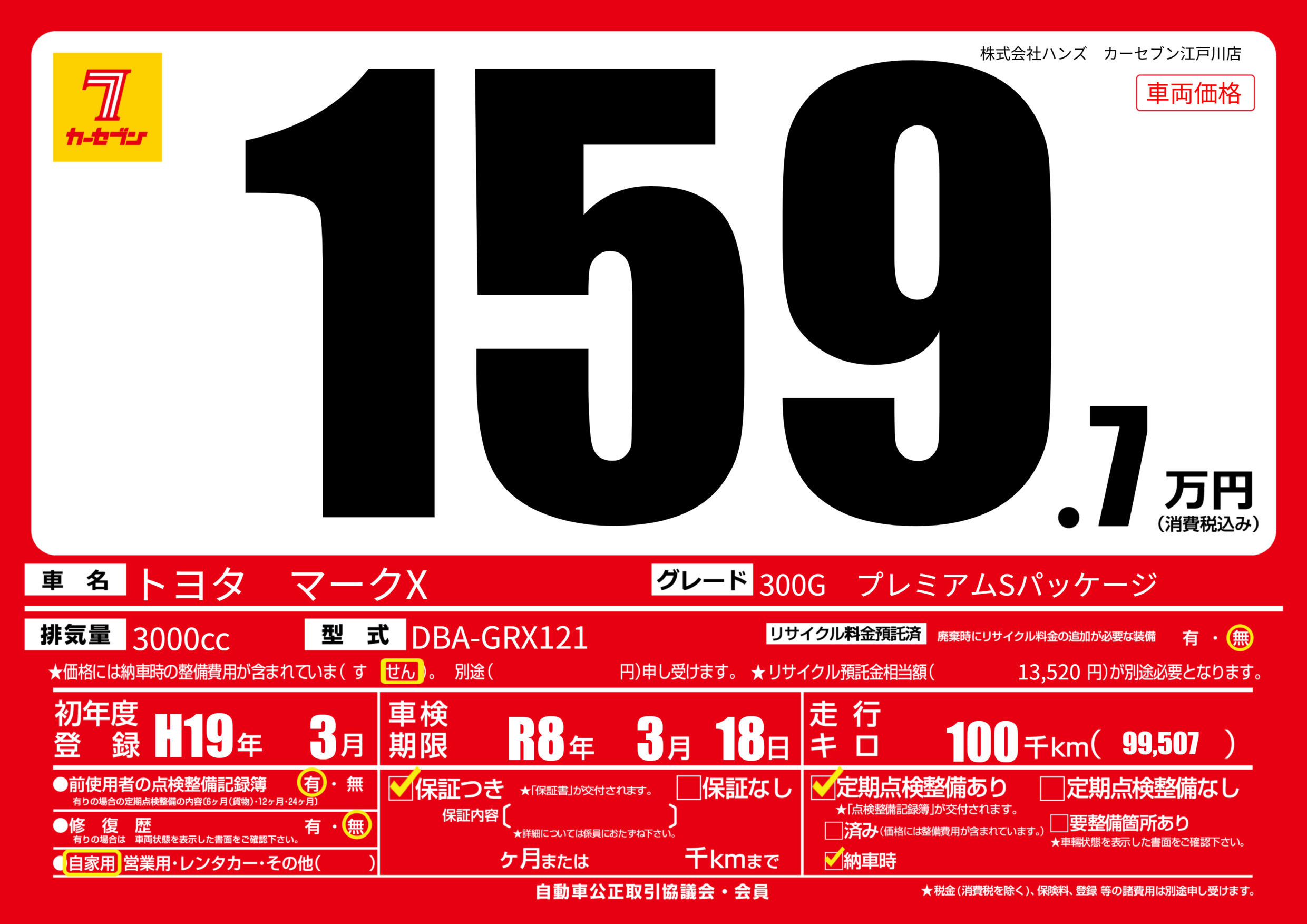 | 車名 | トヨタ マークX | グレード ミッション 排気量 |