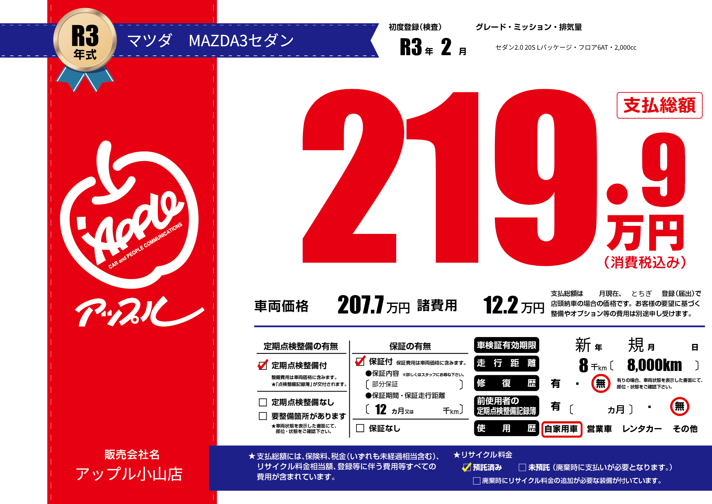 | 車名 | マツダ MAZDA3セダン | グレード ミッション 排気量 |