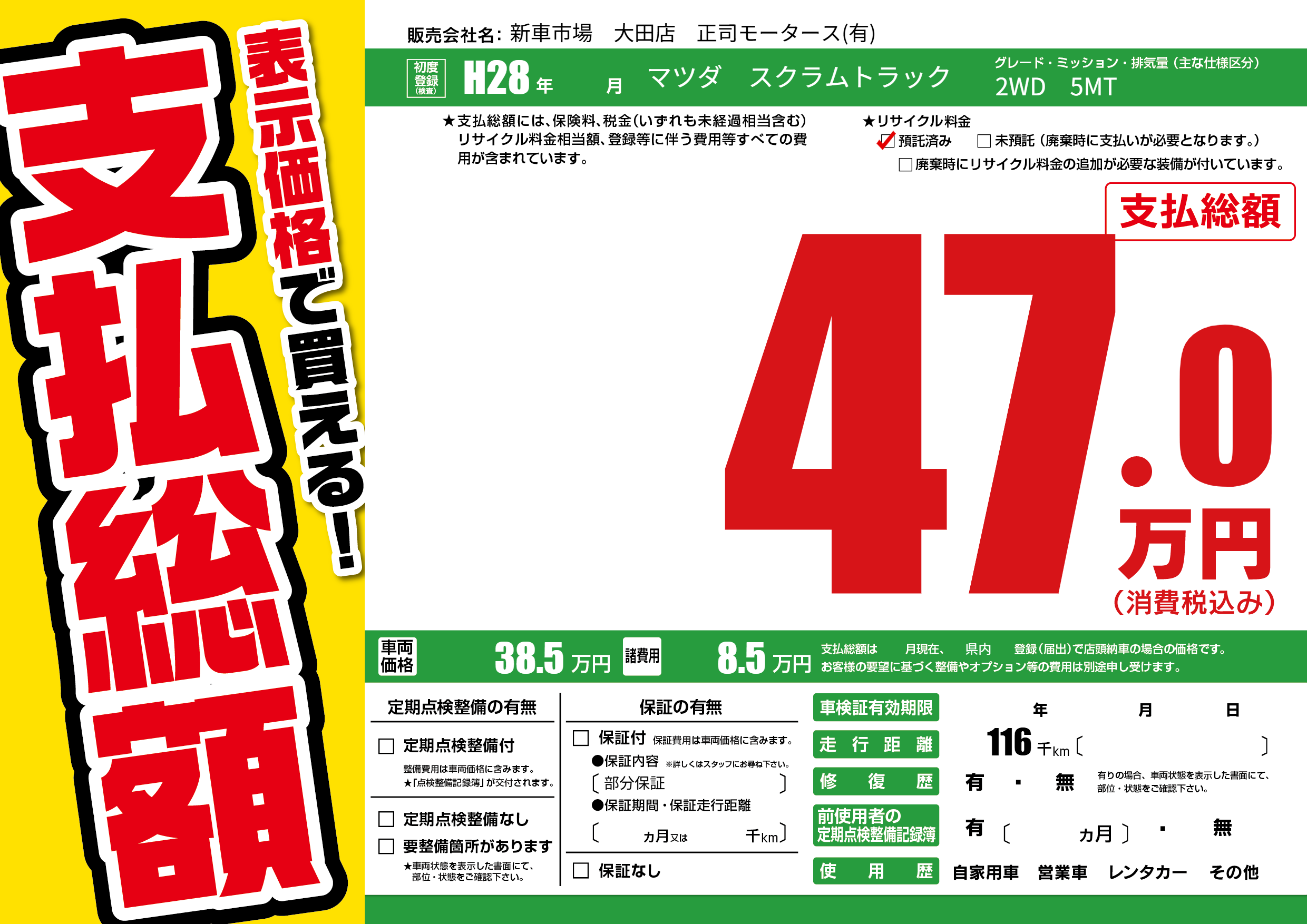 保証なし 保証内容(部分保証) ---ヶ月または()千kmまで |