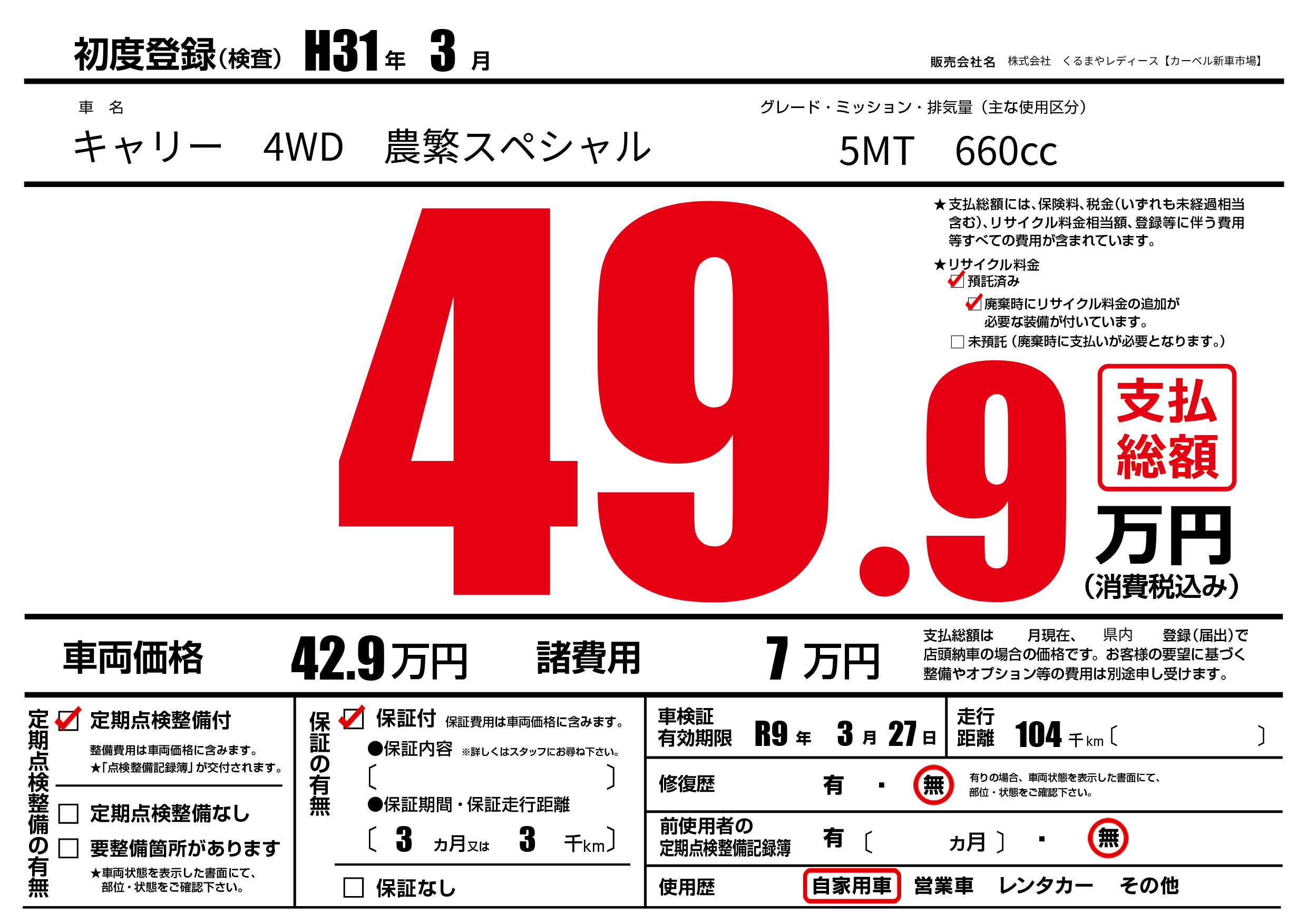 | 車名 | キャリー 4WD 農繁スペシャル | グレード ミッション 排気量 |