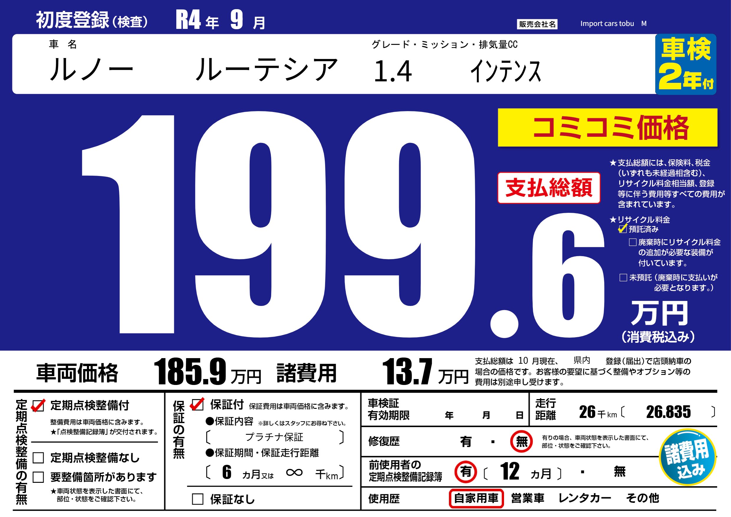 保証付き 保証内容( プラチナ保証) 6ヶ月または(∞)千kmまで |