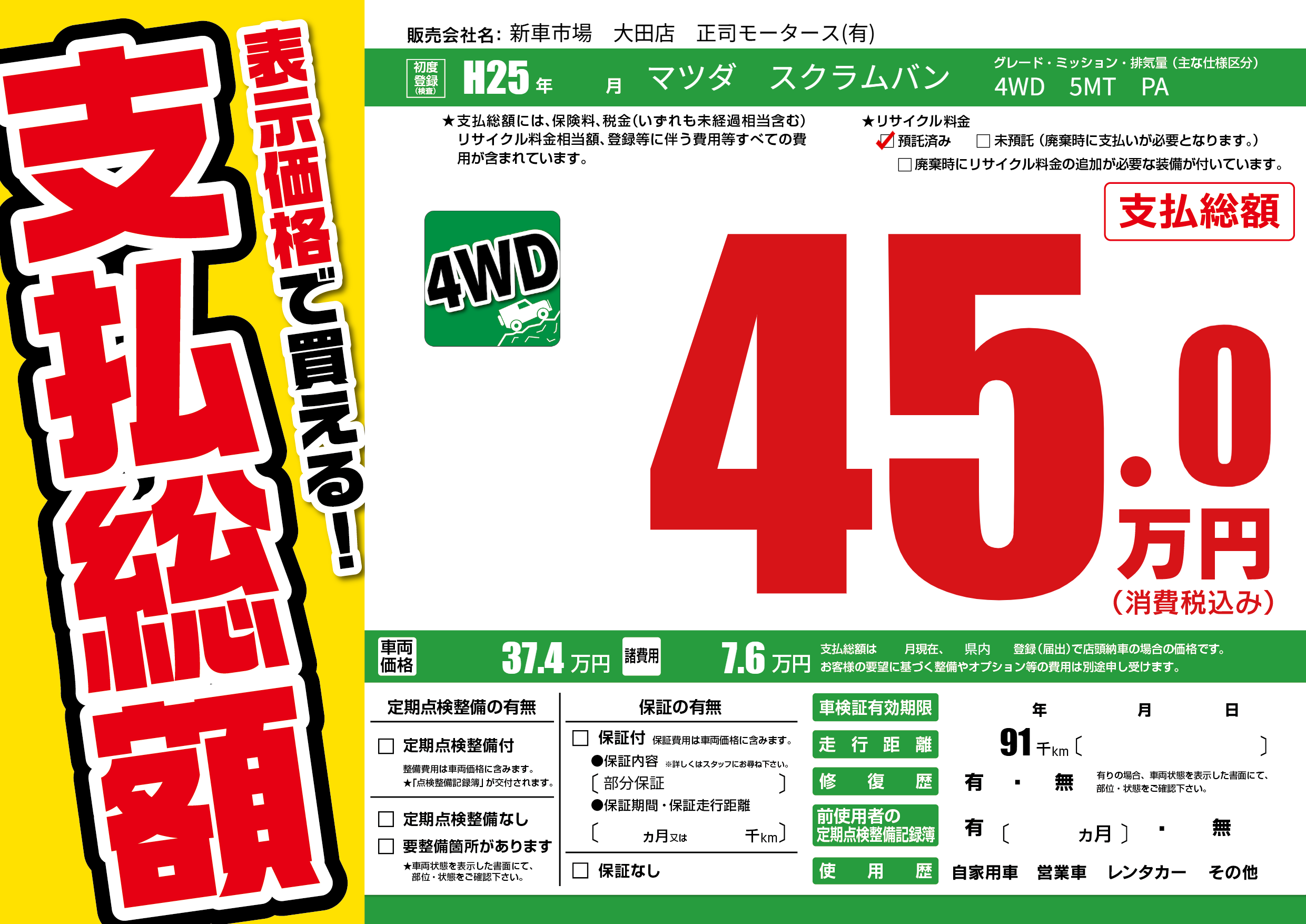 | 走行キロ | 9.1万km | 初年度登録 | H25年---月 |
