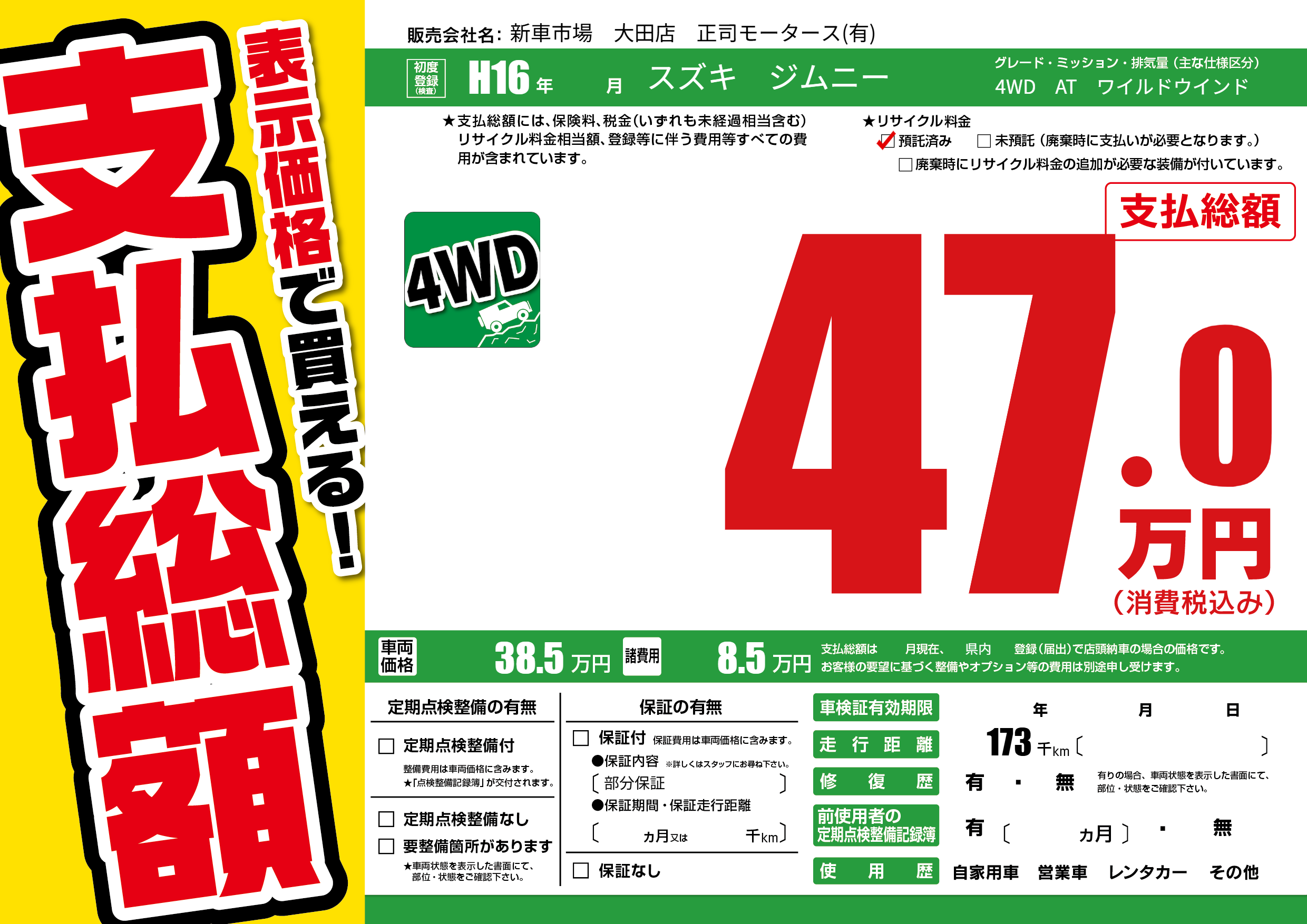 | 車名 | スズキ ジムニー | グレード ミッション 排気量 |