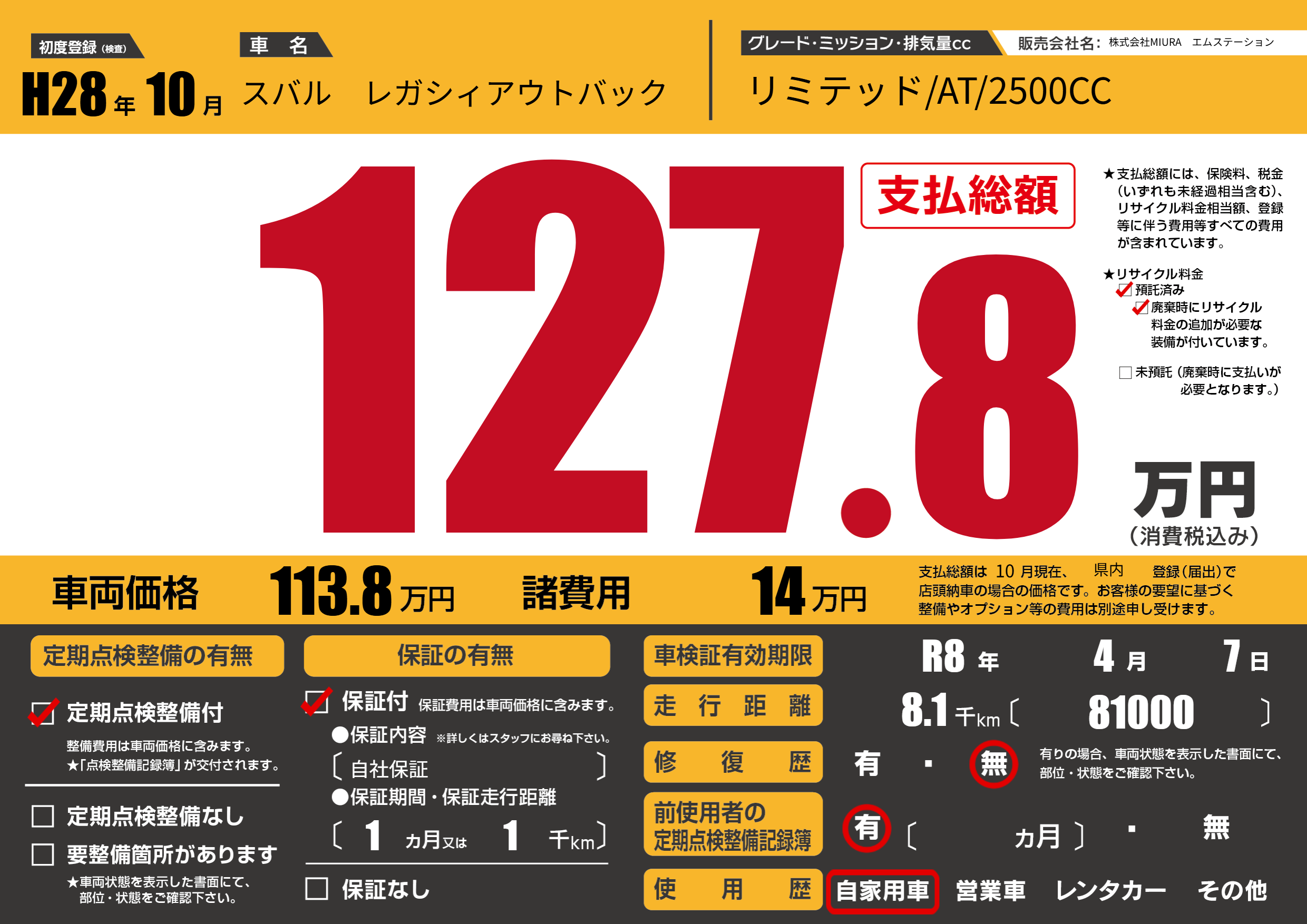 | 車名 | スバル レガシィアウトバック | グレード ミッション 排気量 |