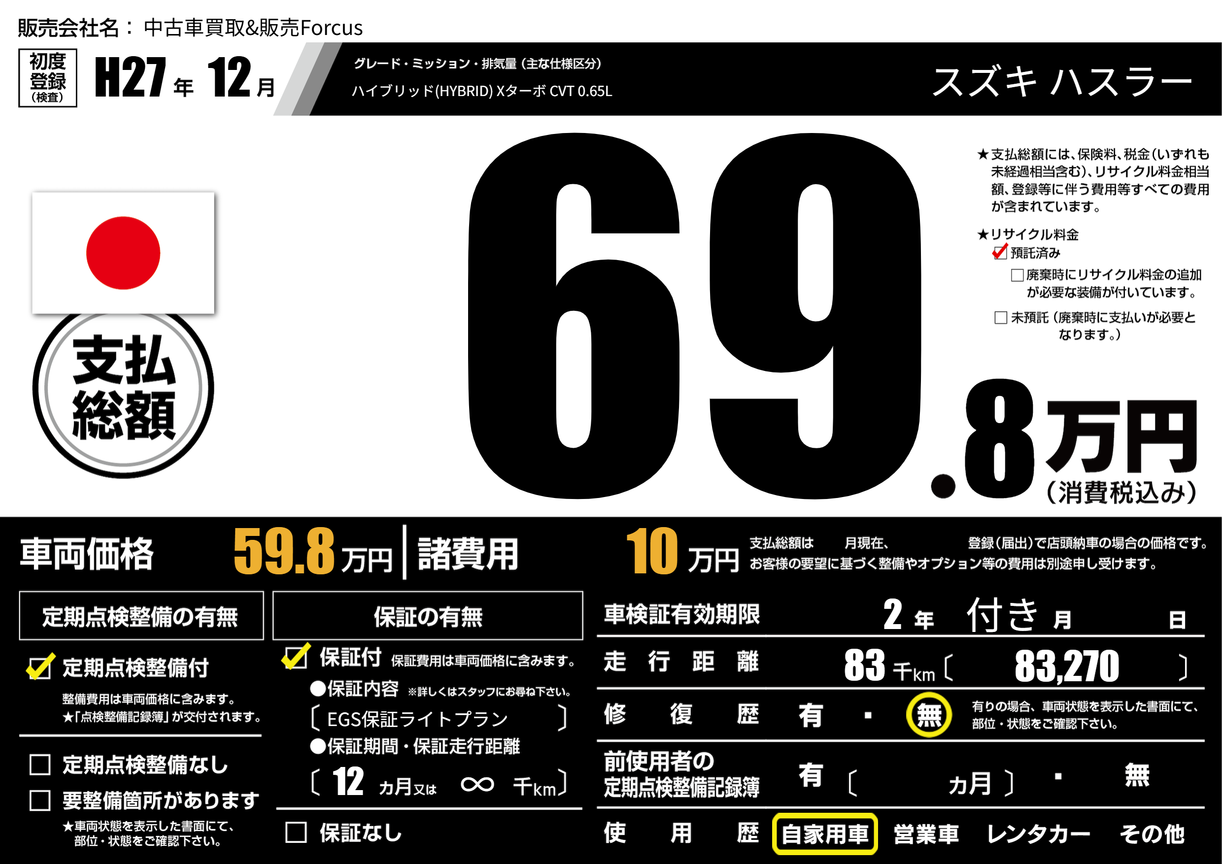 | 車名 | スズキ ハスラー | グレード ミッション 排気量 |