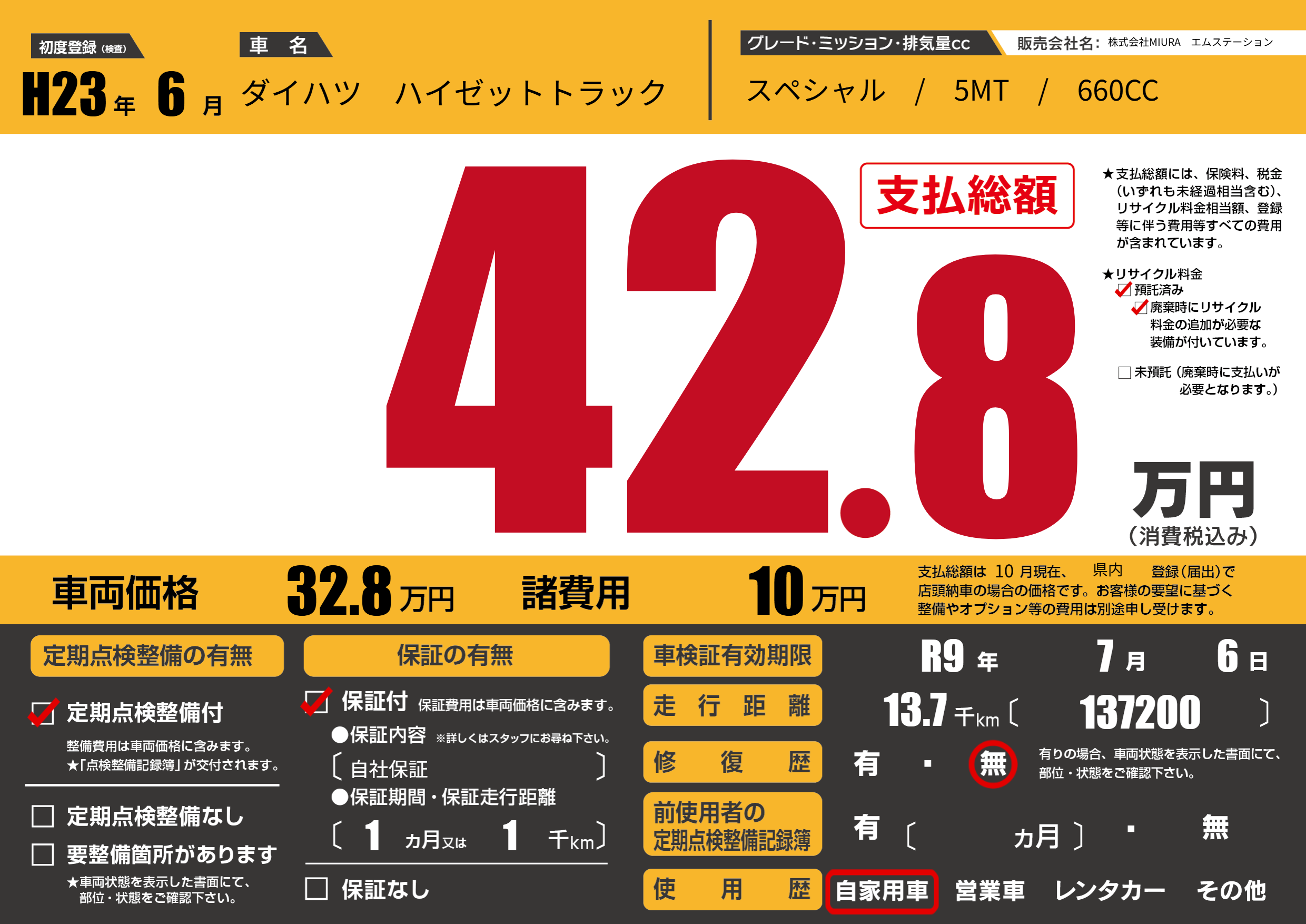 | 走行キロ | 1.3万km | 初年度登録 | H23年6月 |