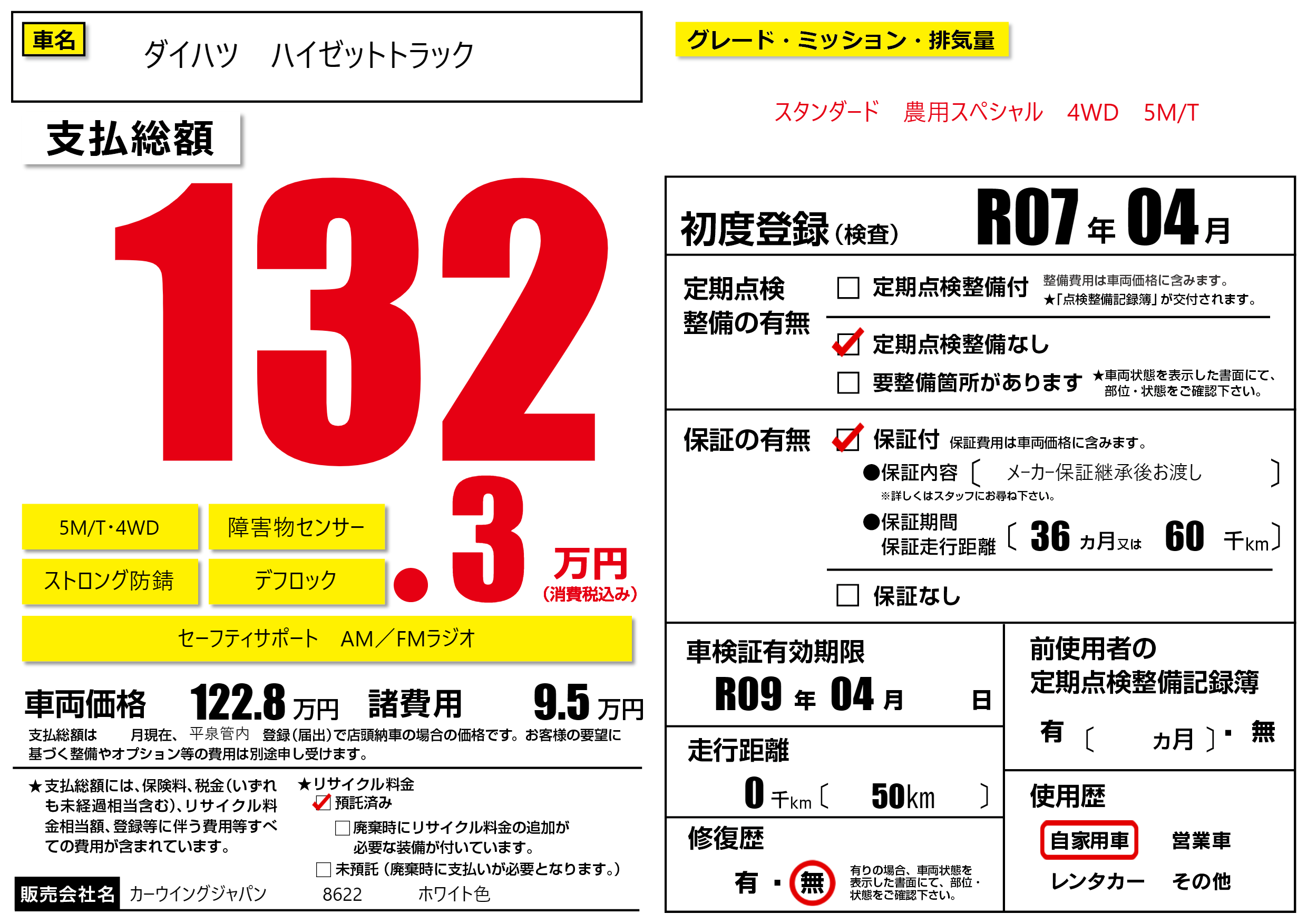 | 車名 | ダイハツ ハイゼットトラック | グレード ミッション 排気量 |