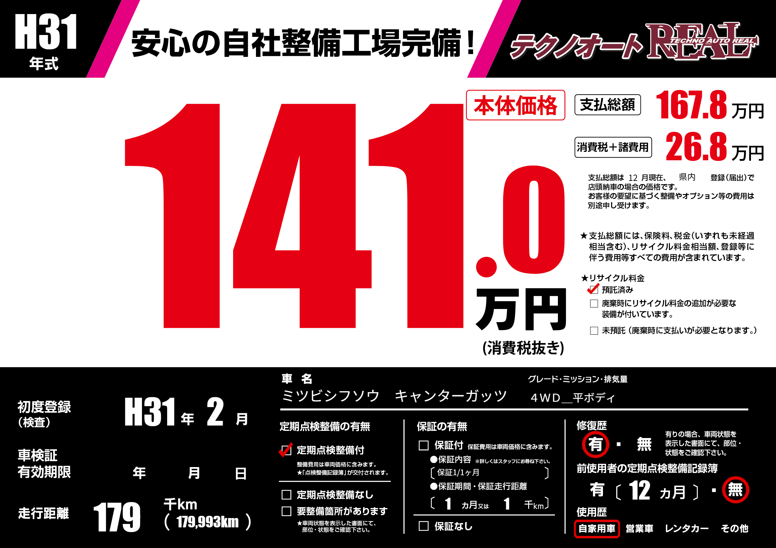 | 走行キロ | 17.9万km | 初年度登録 | H31年2月 |